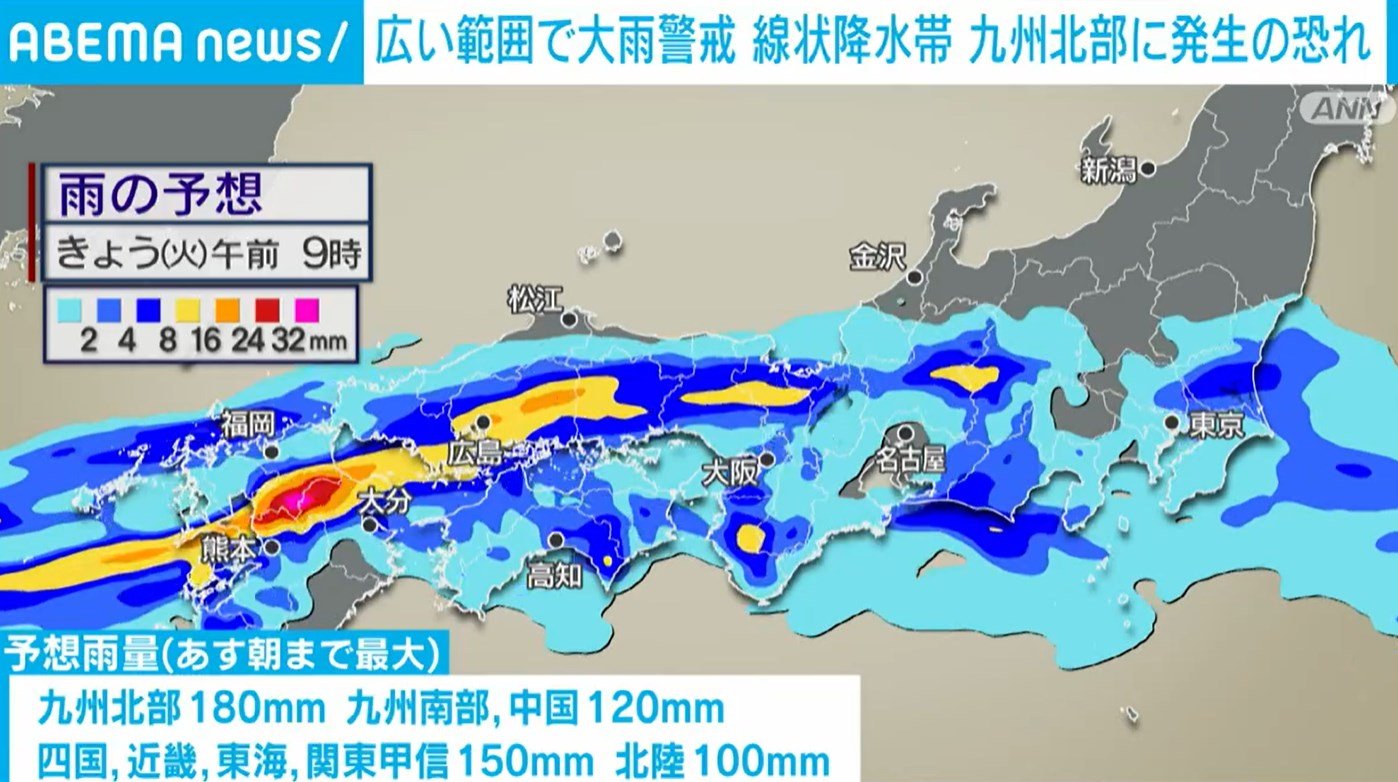 11日朝までの予想雨量は、九州北部で180mm、九州南部で120mmなどとなっています。関東や近畿でも100mmを超える大雨が予想され、道路の冠水や土砂災害、川の増水に警戒が必要です。(ANNニュース)