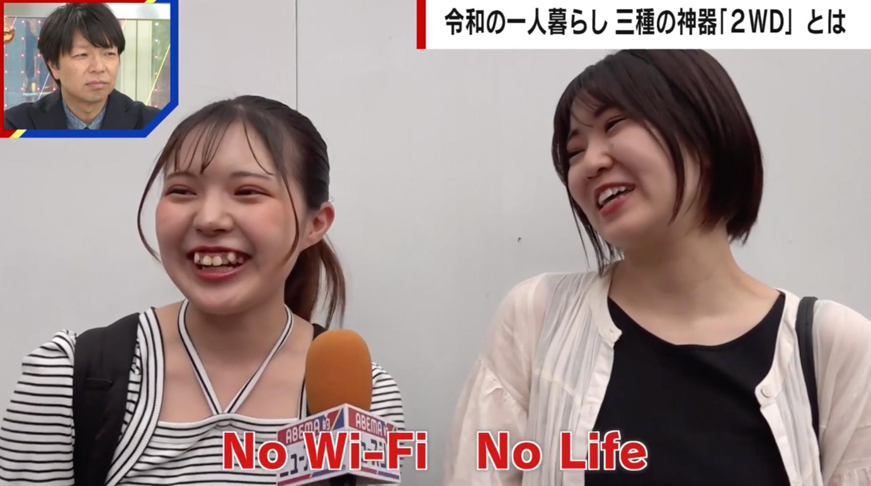 2WD、最初のWは「Wi-Fi」。これがないと生きていけないという声が相次いだ。「Wi-Fi必要です。絶対必要。No Wi-Fi , No Life」「たくさん携帯使うから、ないと困ります」(街の若者)