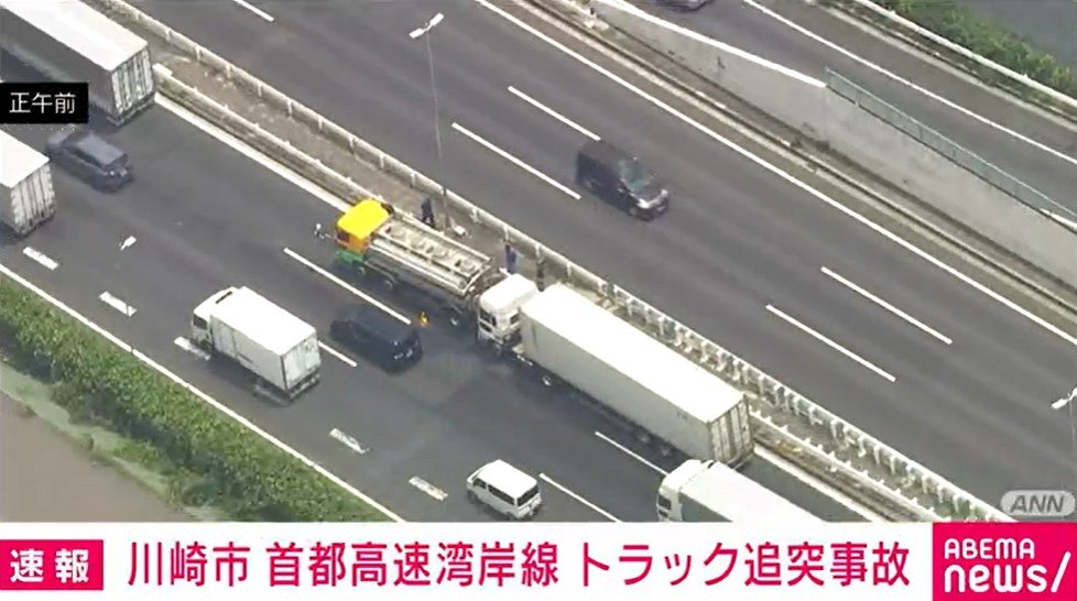 午前10時半すぎ、川崎市の首都高速湾岸線で「大型トラック同士の追突事故があった」と目撃した男性から110番通報がありました。トラックのフロント部分が大破しているということです。