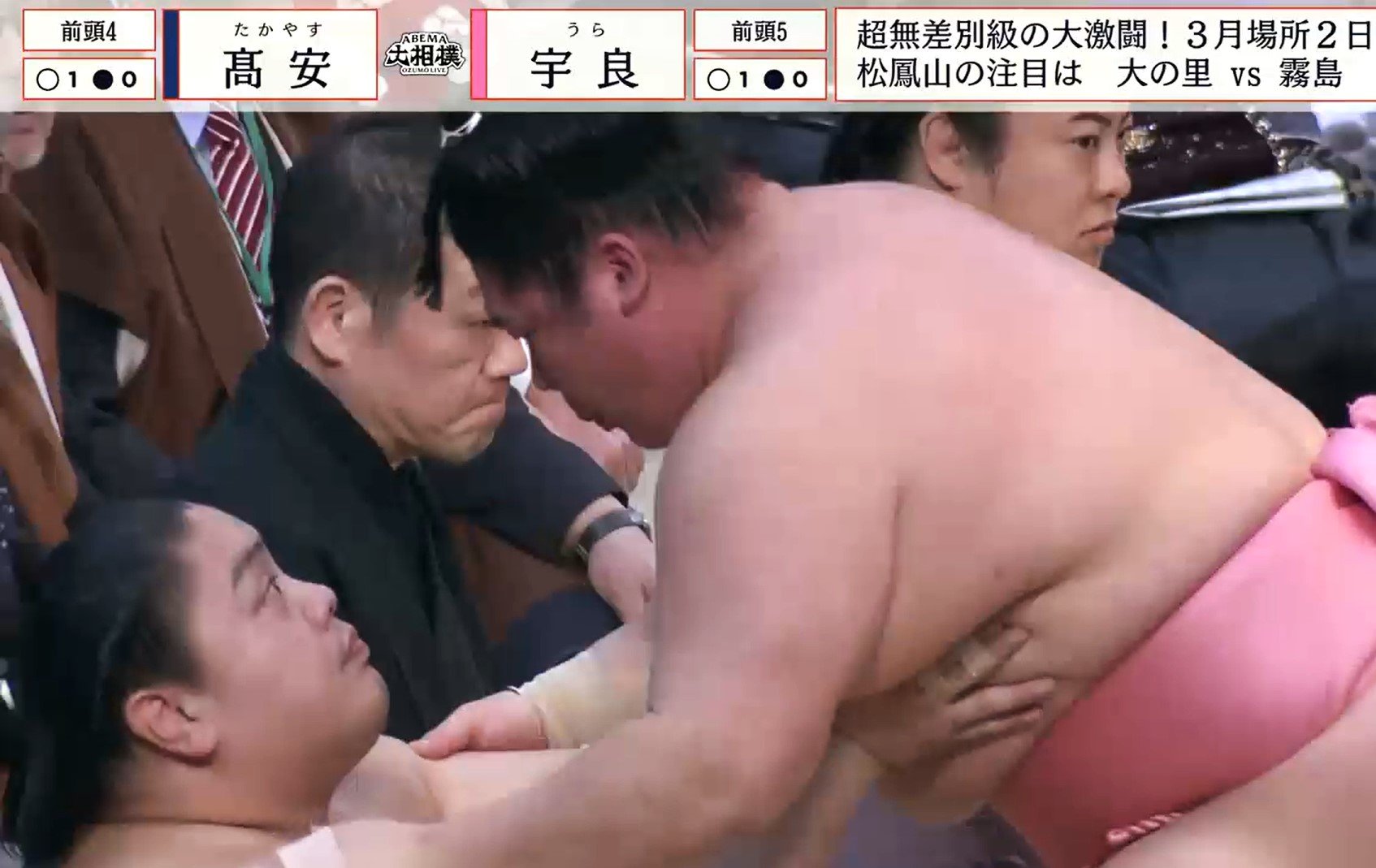 珍しい展開にABEMA実況の清野茂樹アナウンサーは「一山本と至近距離になりました!ウンウンと頷いてましたね」とコメント。同じく解説を務めた元小結の松鳳山は「フハハ(笑)」と笑いをこらえることできず…。その後、「高安関、やっぱり上手かったですね。絶対に懐に入れないという」と取組について話すと「やっぱり、ああなるんですよ。相手の前に行くので。『ごめんなさい』『大丈夫です』みたいな、そういう感じ」と珍しいシーンの“解説”まで行った。