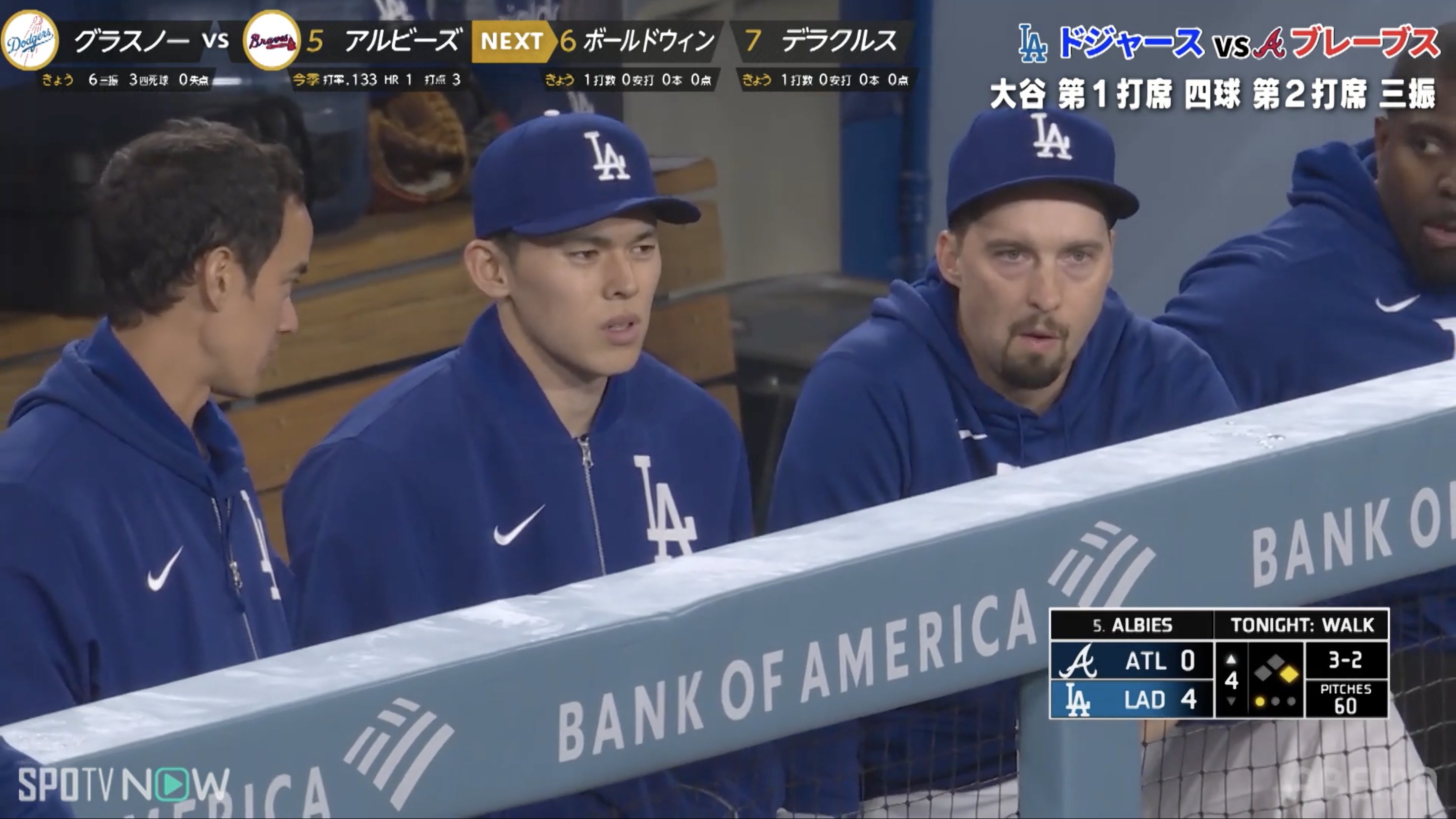 カードが変わって迎えたブレーブスとの3連戦初戦、佐々木はベンチから試合の様子を伺う。その隣にはサイ・ヤング賞投手であるスネルの姿も。アントン通訳、佐々木、スネルの3人が並んで座り、先発・グラスノウの投球を見ながら、何やら真剣な表情で話し込む姿が中継映像に映し出された。