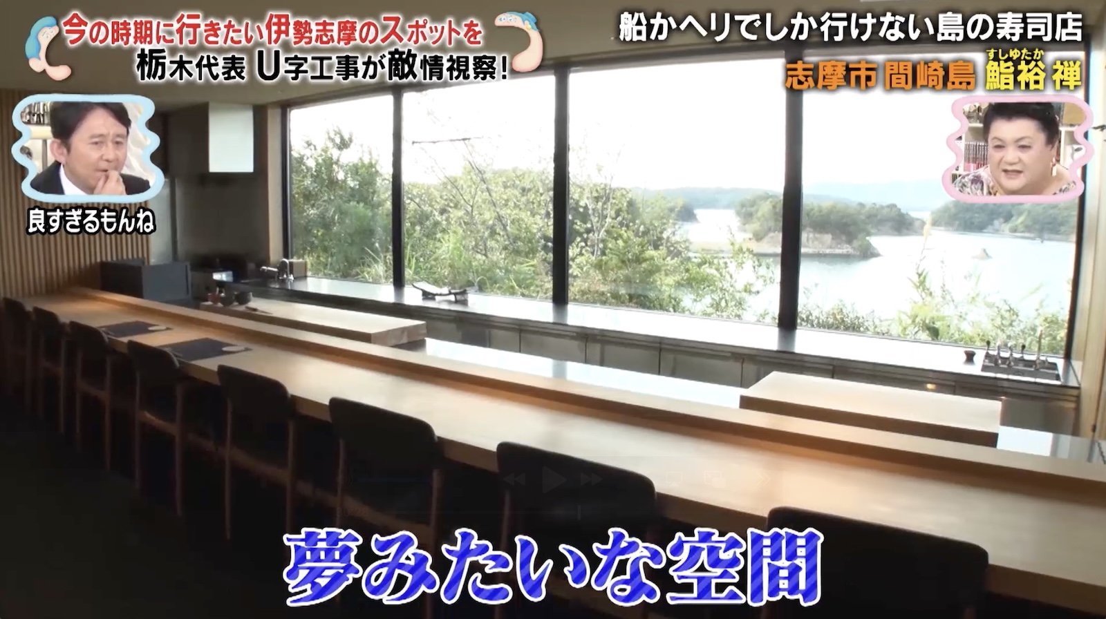 5月9日に放送された『マツコ&有吉 かりそめ天国 2時間SP』(テレビ朝日)では、U字工事が栃木に無い魅力を探しに、三重・伊勢志摩を調査した。そんな中で船かヘリでしか辿り着けない小さな島にある超贅沢なお寿司屋を訪れた。