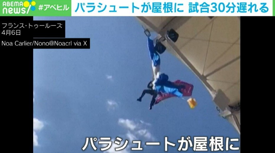 4月6日、フランス・トゥールーズのラグビーの試合会場で、パラシュートで降りてきたパフォーマーが屋根に引っ掛かり、数分間、宙づりになるという“珍騒動”が起きた。