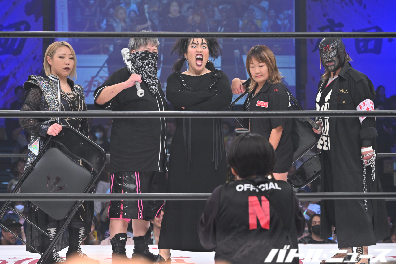 まずは、長与千種プロデュース・Marvelous協力により、ネトフリ極悪プロレススペシャルマッチとして【ゆりやん軍団】ドレイク森松&永島千佳世&DASH・チサコ&ZAP-Tvs【唐田&剛力軍団】彩羽匠&桃野美桜&Maria&川畑梨瑚の8人タッグマッチが実施。