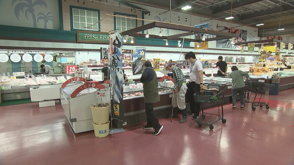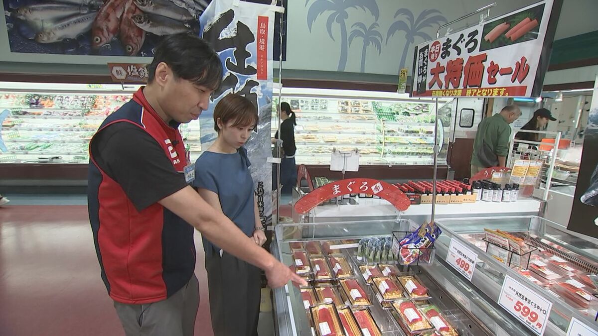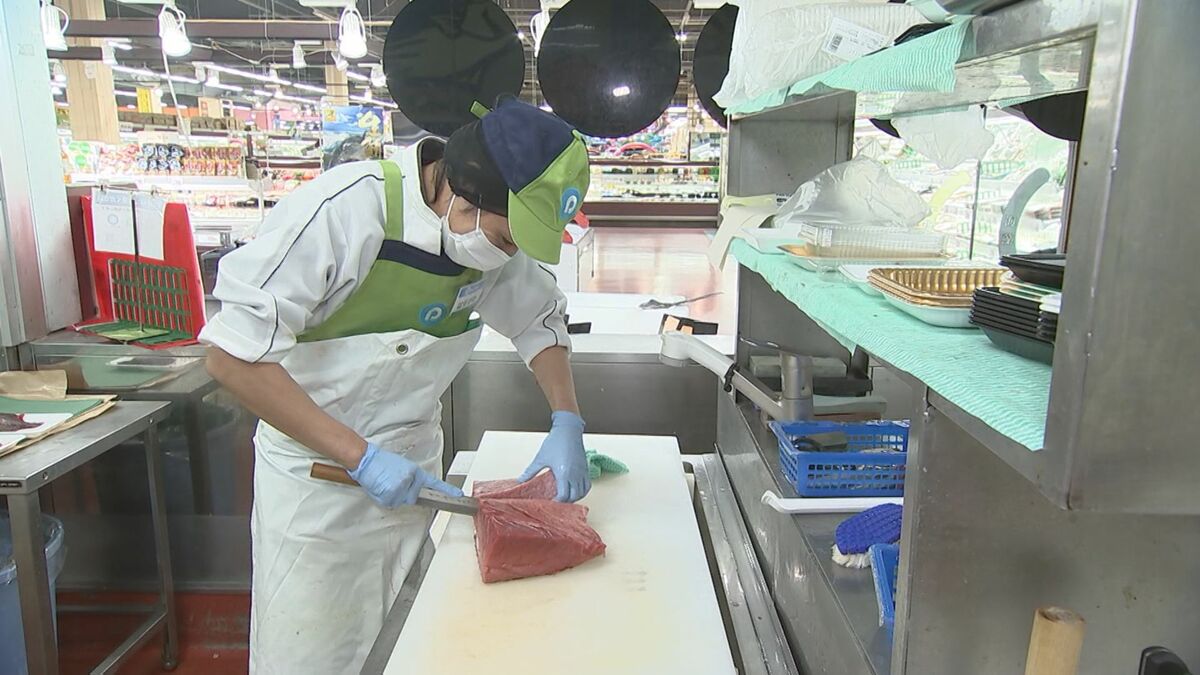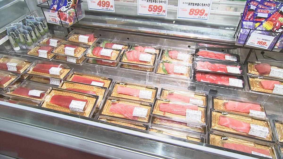 「スーパーの鮮魚コーナーに来ています。こちらの店では本日マグロ大特価セールが行われています。」