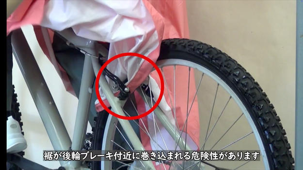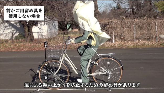 さらに、前カゴまで覆える雨具では、裾が舞い上がって視界が遮られる様子も紹介。
