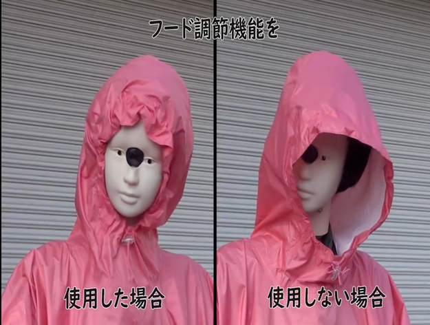 動画では、顔の中心にカメラを内蔵したマネキンでフード付き雨具着用時の視界を再現。フード調整機能を使うように呼びかけました。