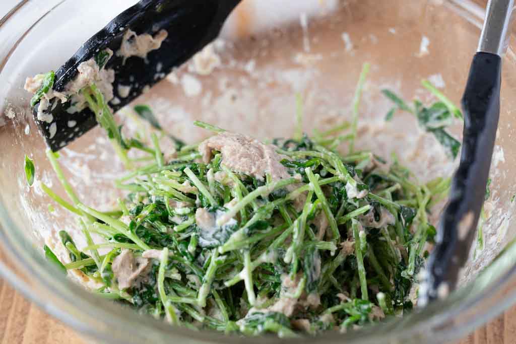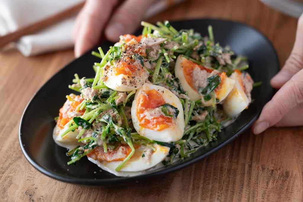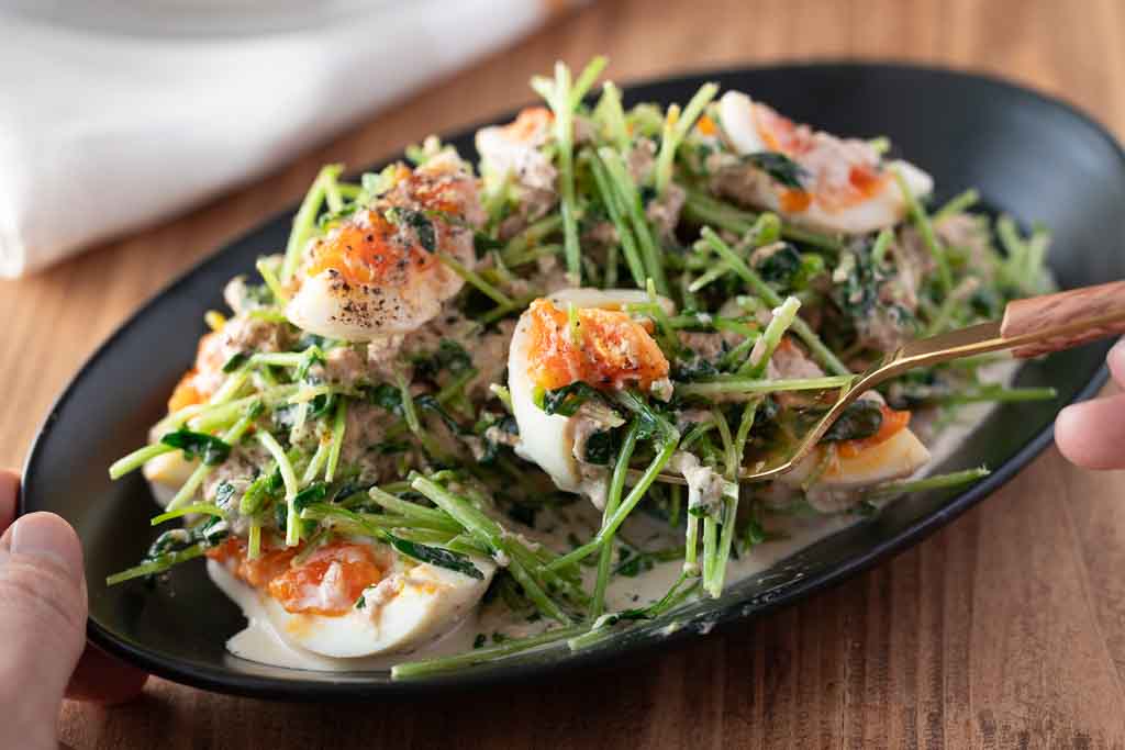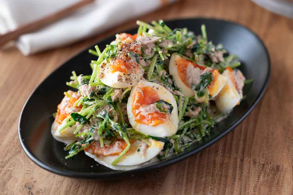 ツナのうまみとマヨネーズのコク、すりごまの香ばしさが豆苗に絡んで、箸が止まらないおいしさに。