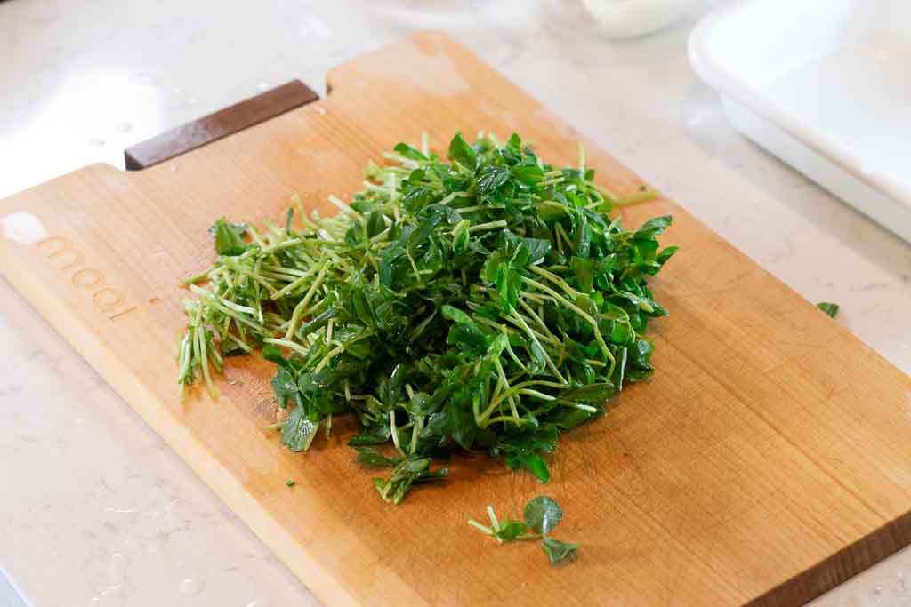 1、豆苗を3cm幅に切る。ゆで卵は食べやすい大きさに切る。