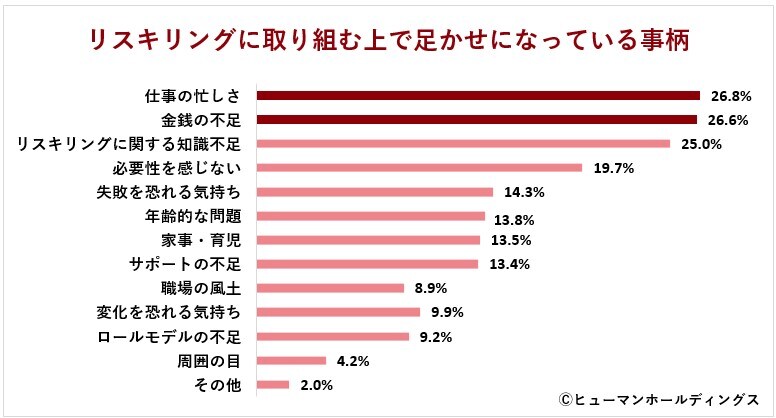 同調査では「リスキリングに取り組む上で足かせになっているもの」についても質問している。最も回答率が高いのは「仕事の忙しさ」(26.8%)だった。僅差で「金銭の不足」(26.6%)が続く※。