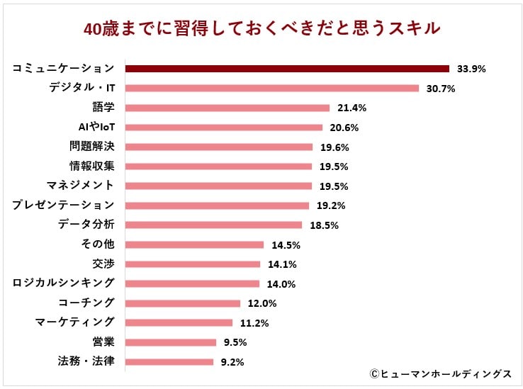 同調査ではそのような質問を投げかけている※。最も回答率が高いのは「コミュニケーション」(33.9%)だった。そのほか上位には「デジタル・IT」(30.7%)や「AIやIoT」(20.6%)といった技術系のスキルが並ぶ。