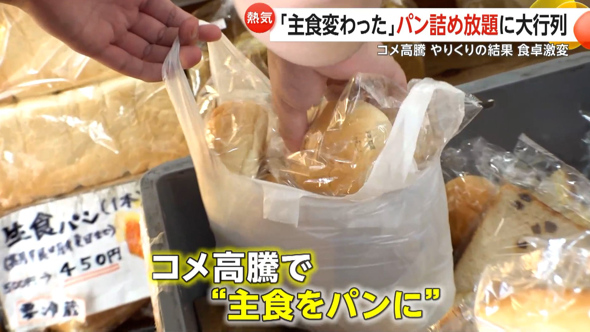 米の高騰を受け、190円の“パン詰め放題”が人気を集め、中には主食をパンに切り替えたという人も。