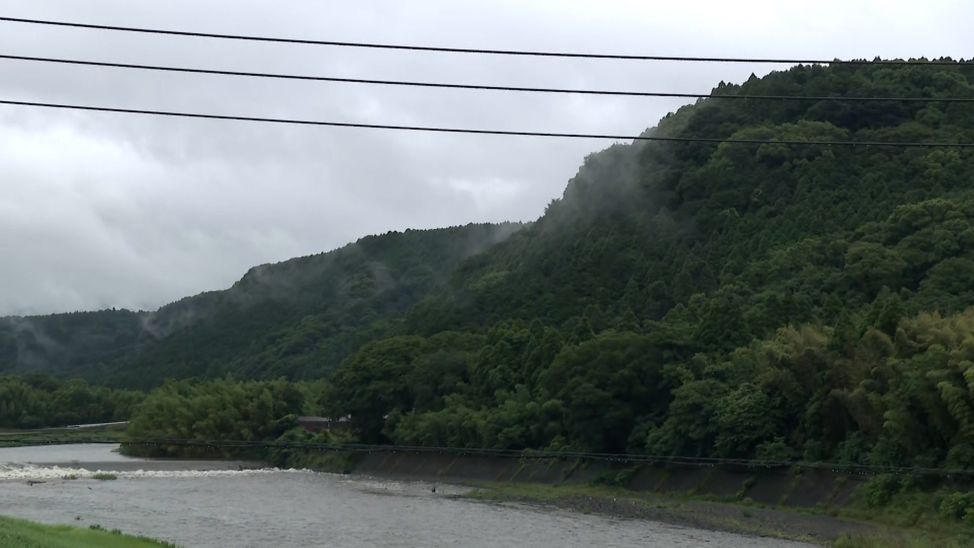 中継場所の橋は白川という1級河川の上に架かっていて、雨の影響で川の流れも勢いが強い印象があり、茶色い、勢いのある水が下流に向かって流れています。