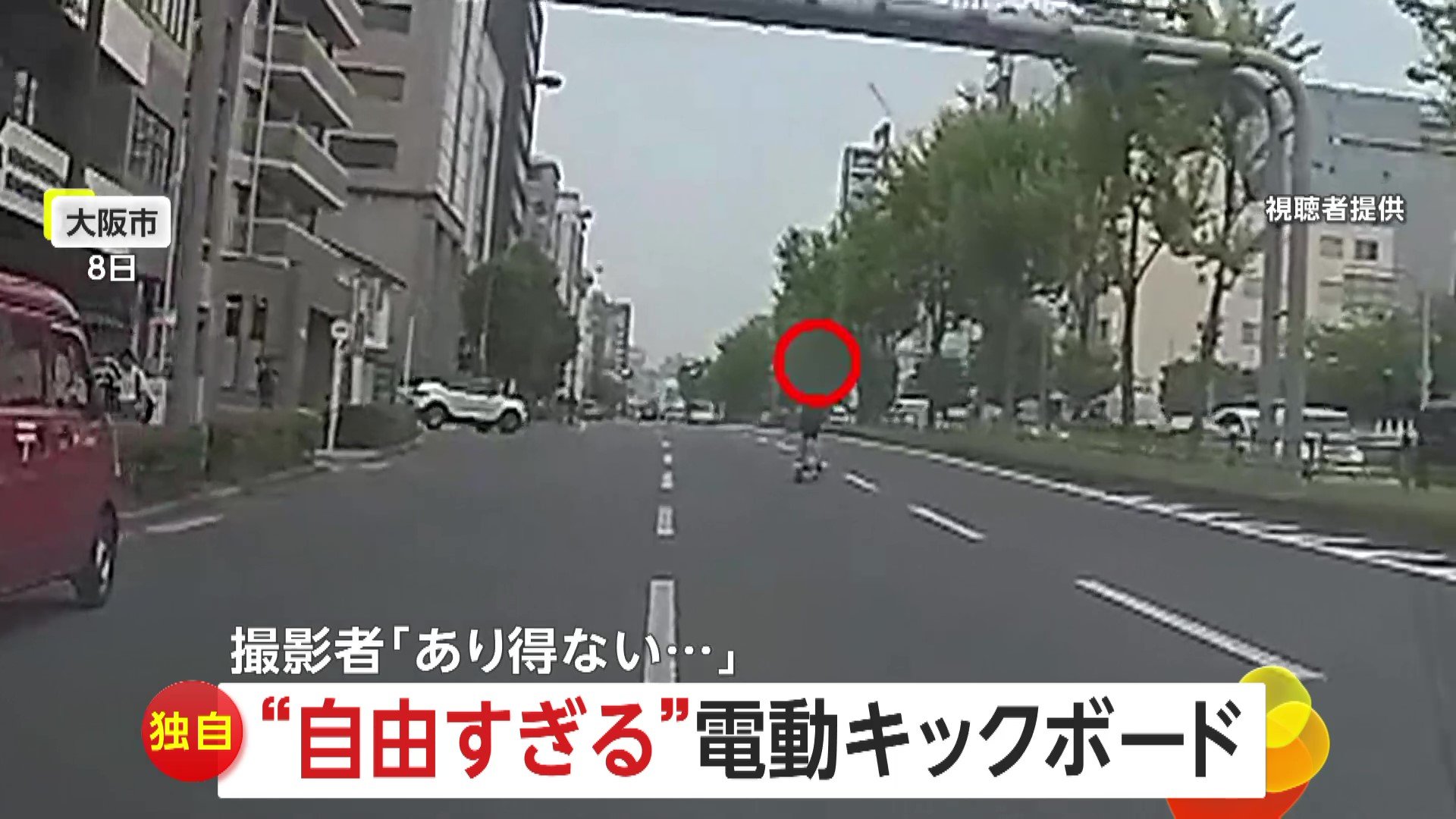 大阪市で8日、走行中のドライバーが撮影したのは、3車線の右側をふらふらと走る電動キックボードだ。“自由すぎる”その走行は、交通ルールを無視した危険行為だった。