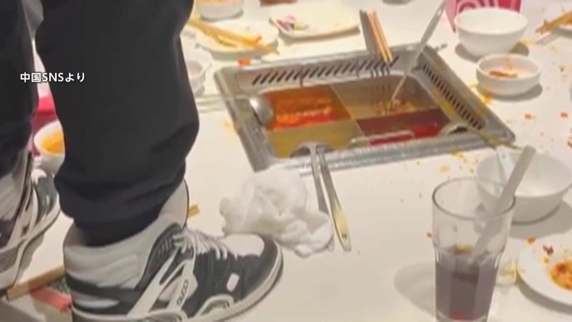 客が店のテーブルに土足で立って、足元にある激辛の火鍋に“迷惑行為”をする様子が捉えられていた。