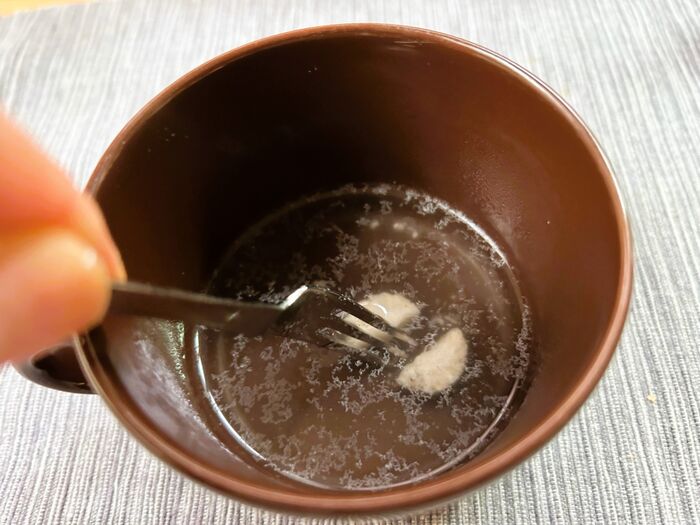 早く溶かすには、キッチンハサミで切るか、少量の熱湯をかけてフォークで砕くといいかも。
