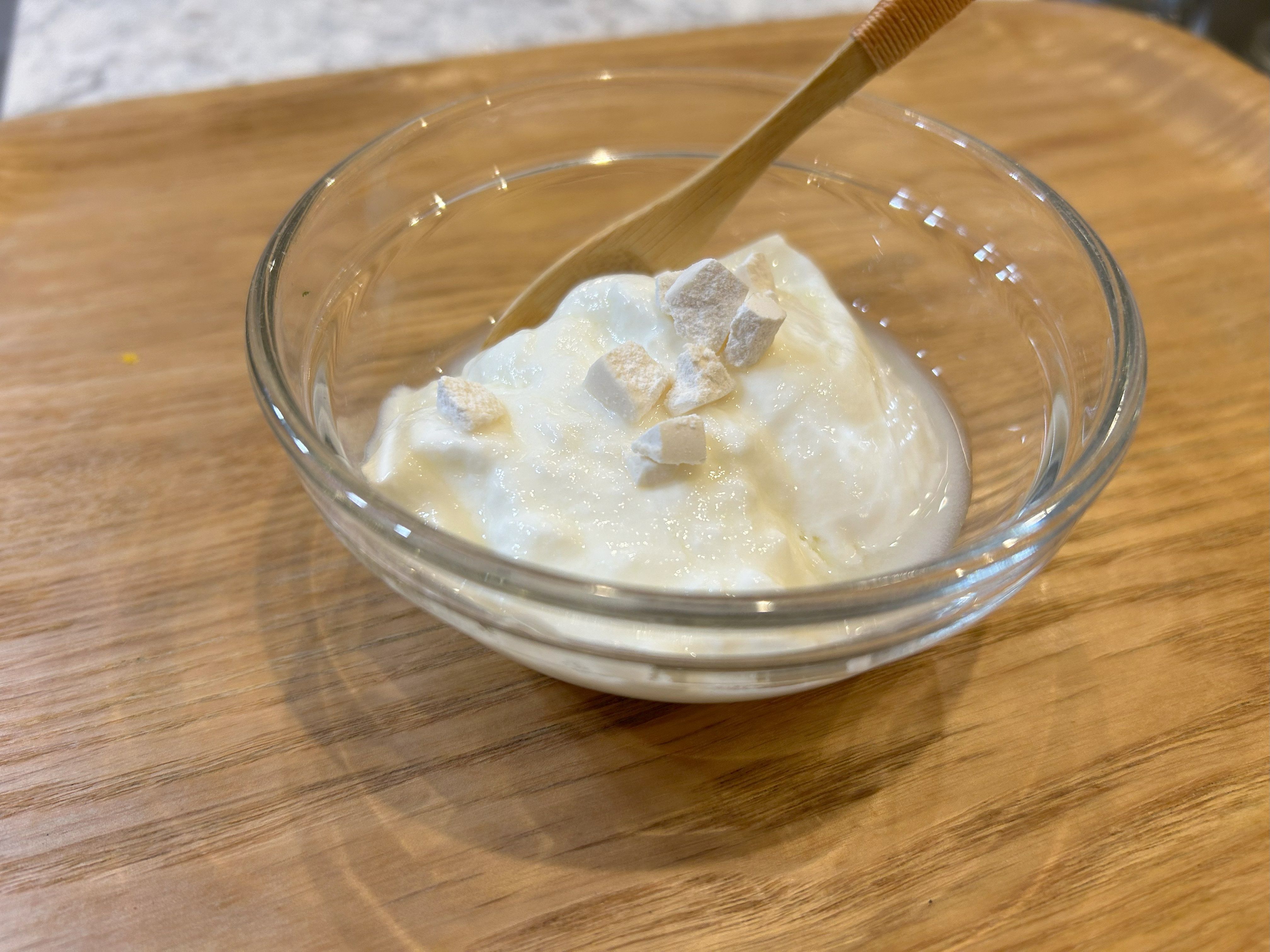 1つ目は、ヨーグルトトッピング! 硬いのでキッチンばさみで細かく砕き、ヨーグルトにかけます。これが予想以上においしい!