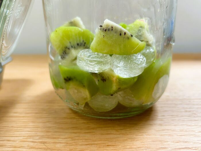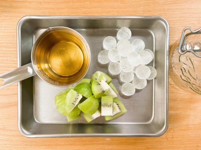 まず、フルーツ(今回はキウイフルーツ。皮をむいてカット)を冷凍。500mlの保存瓶は熱湯消毒して、アルコール消毒をします。