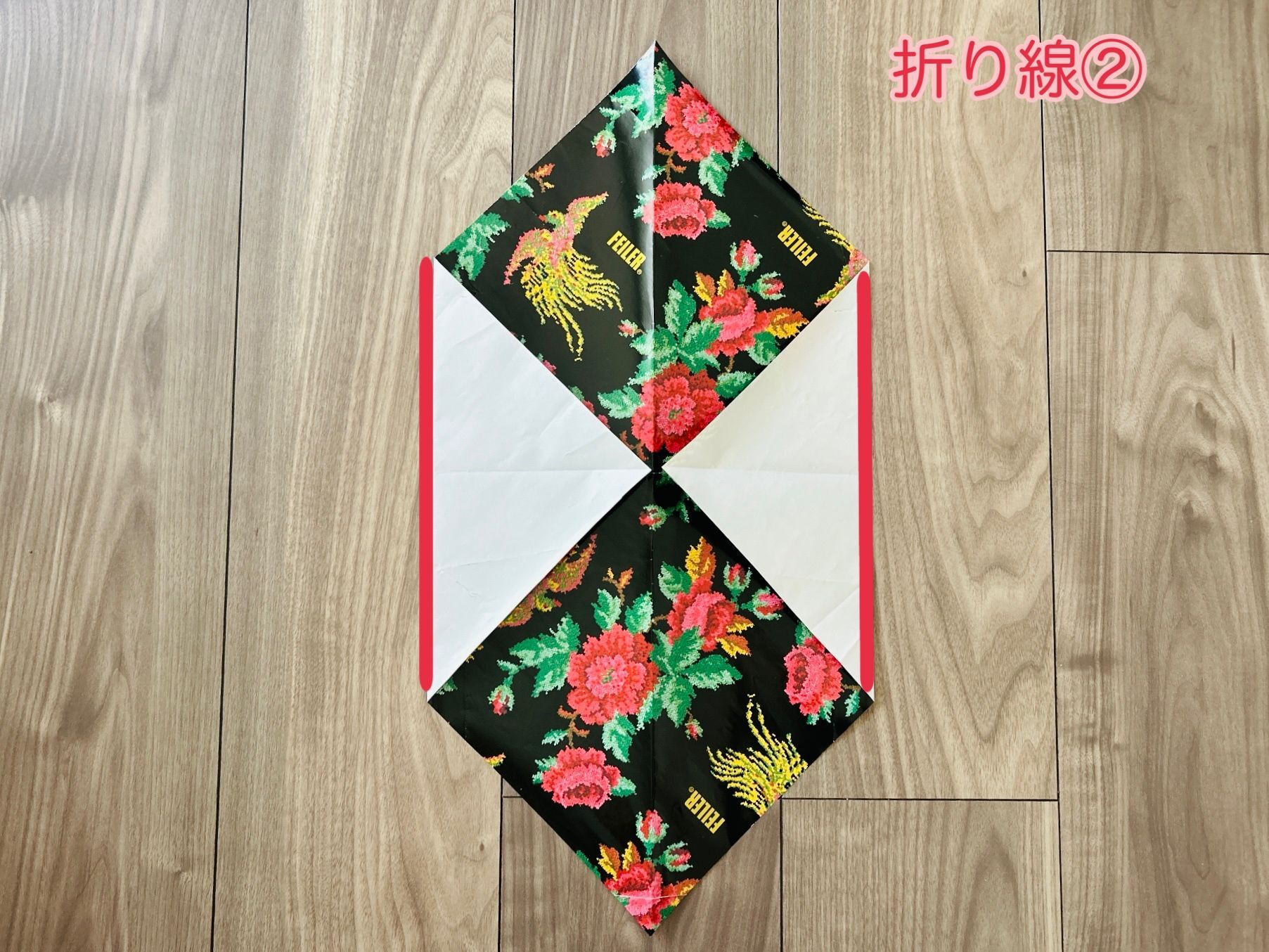 反対側の角も同じように折り、新たな折り線をつけます。(折り線②)