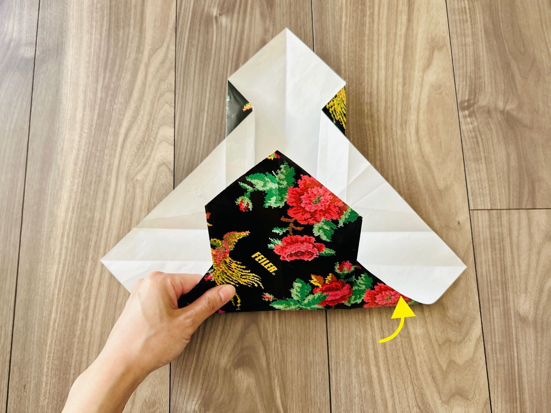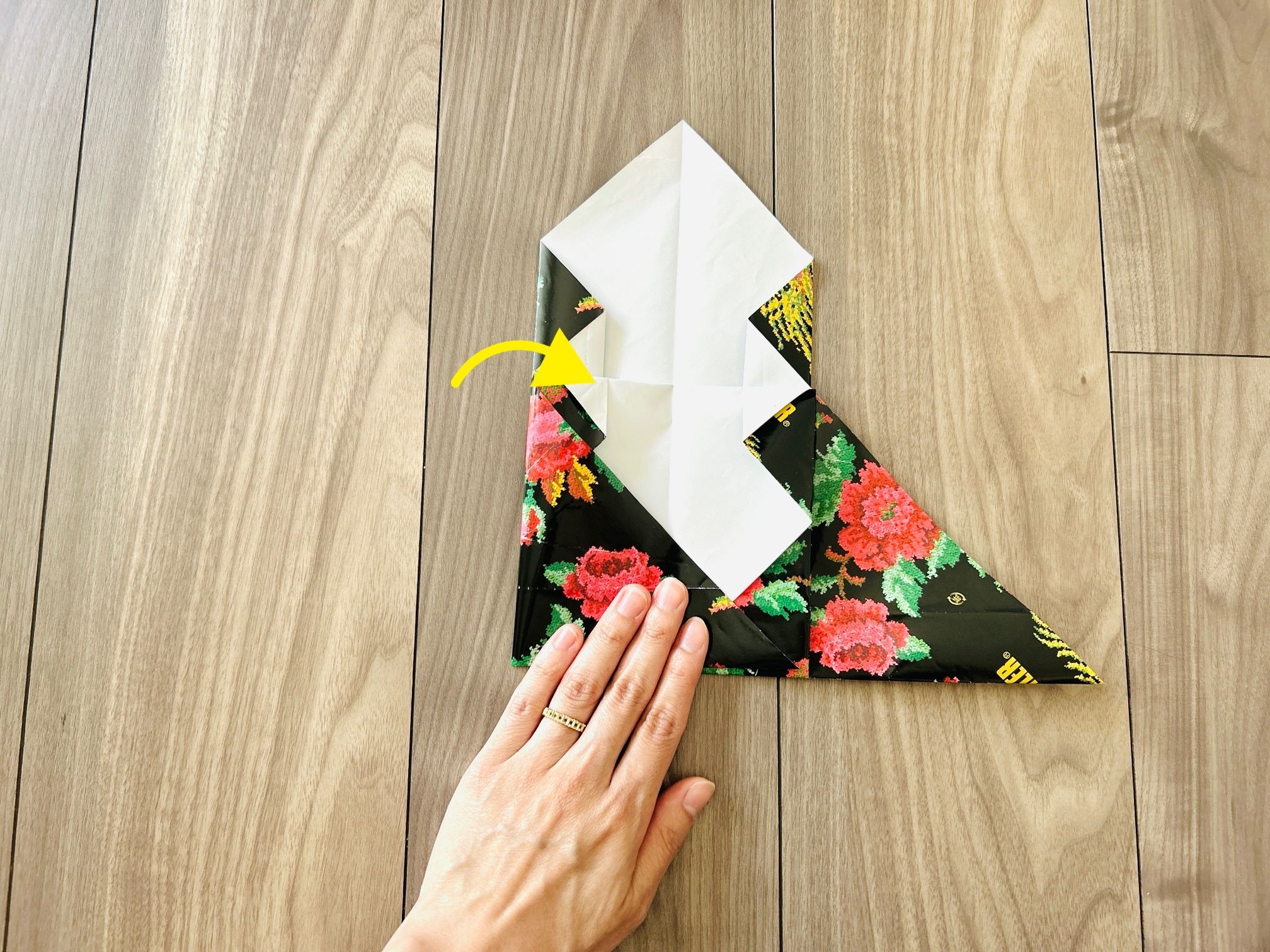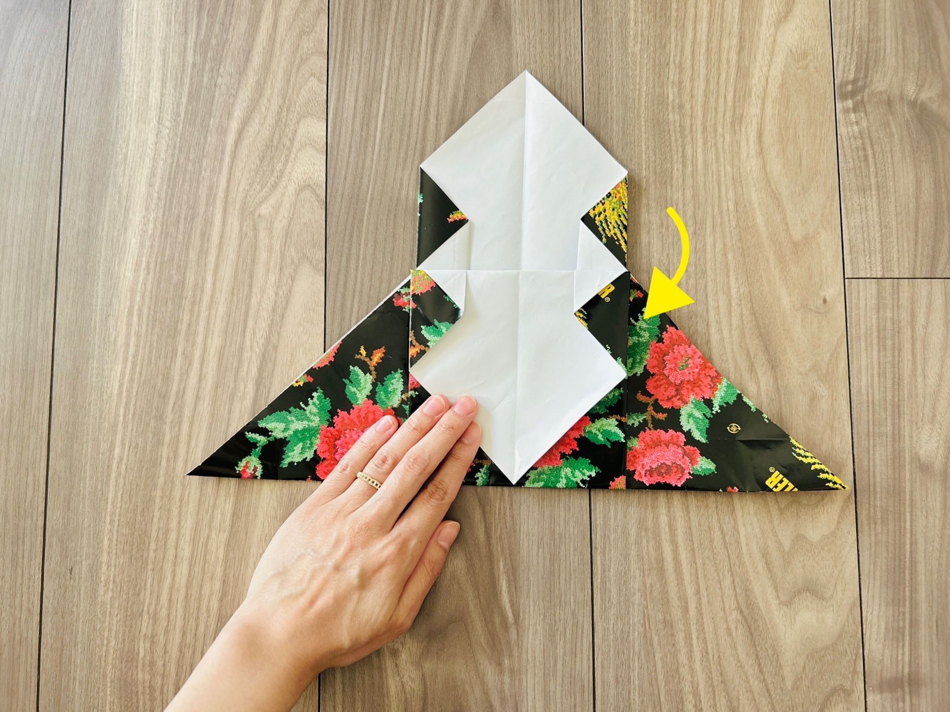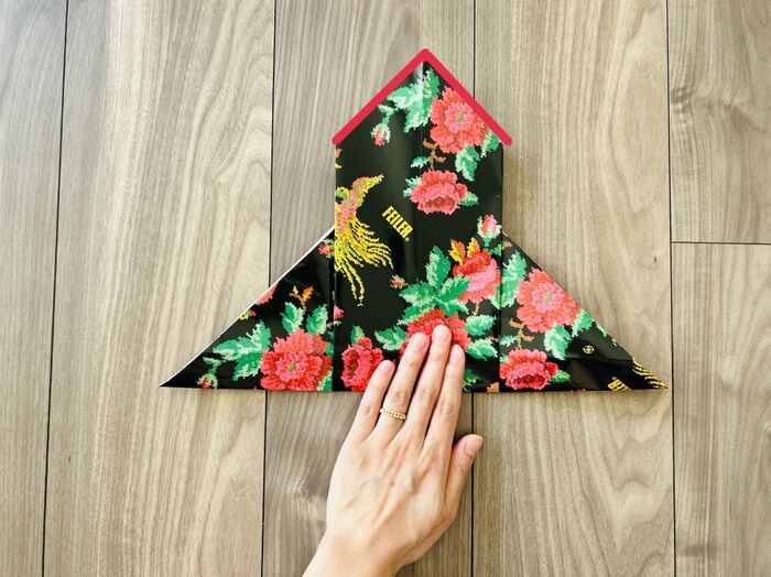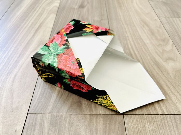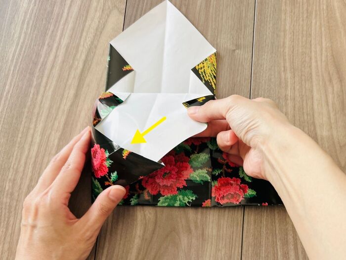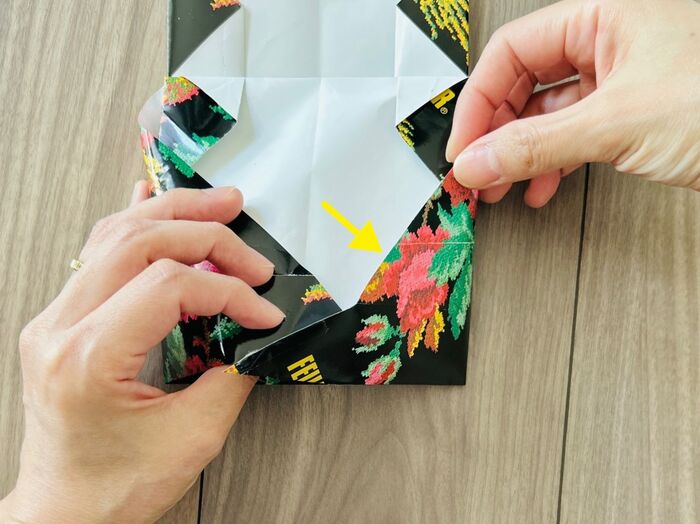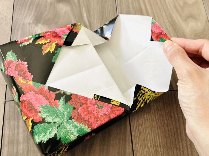 次に、右側の角も同じよう折り目をつけたら開き、左側の角を差し込みます。