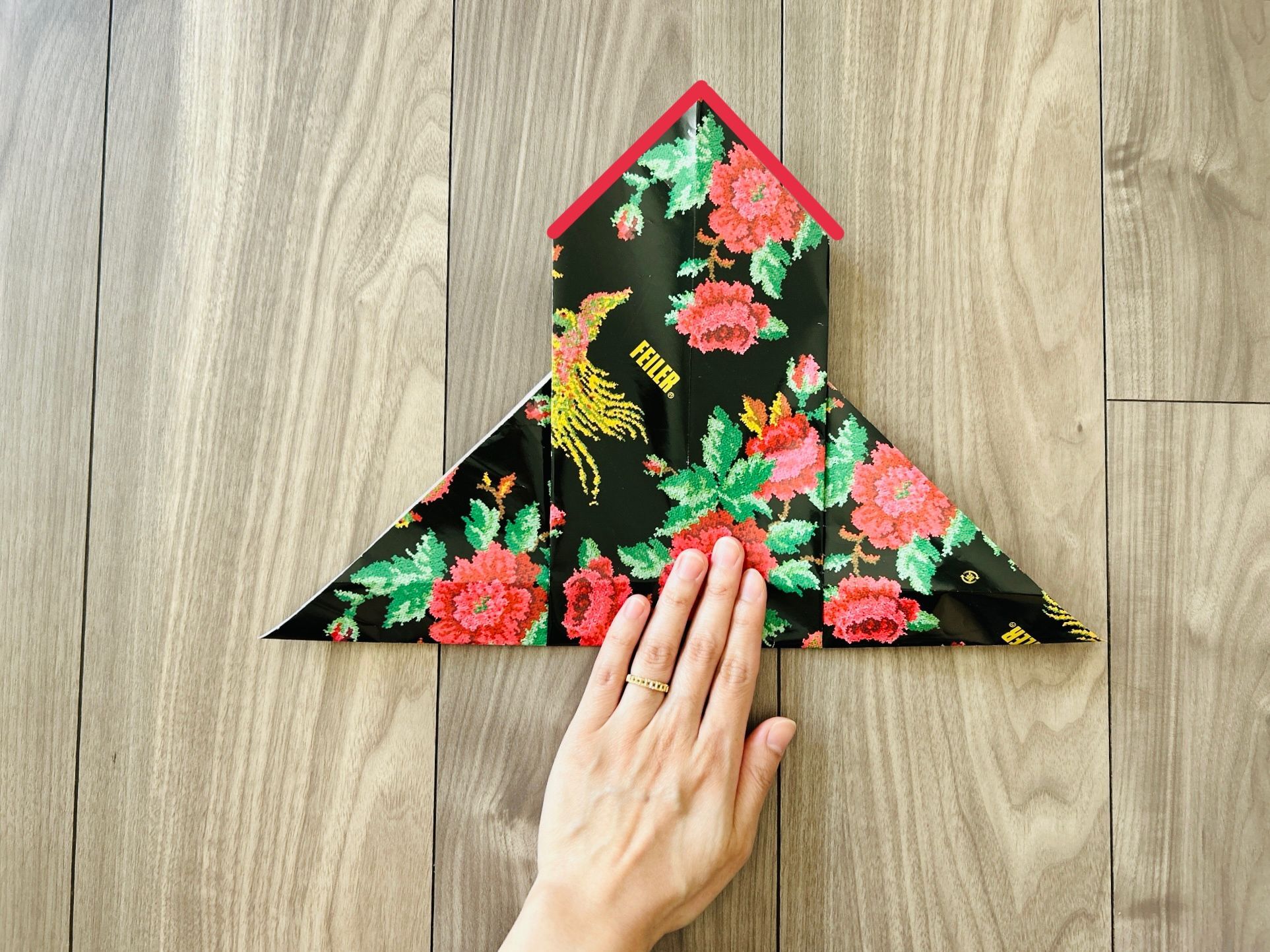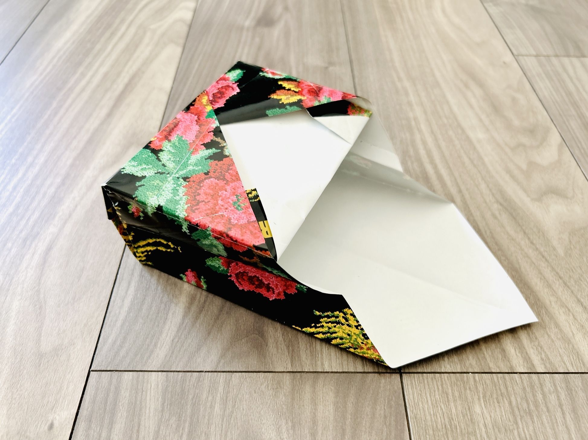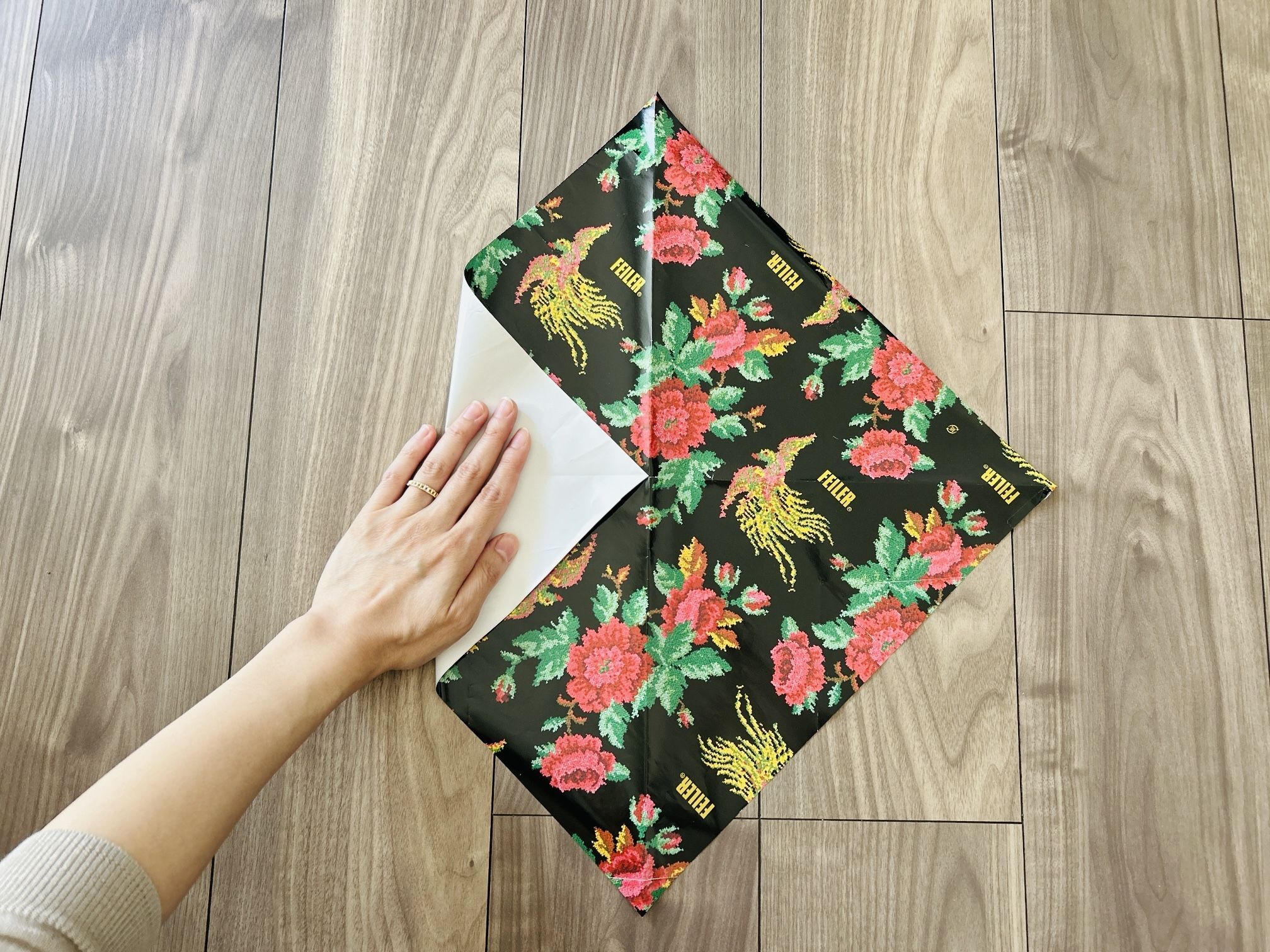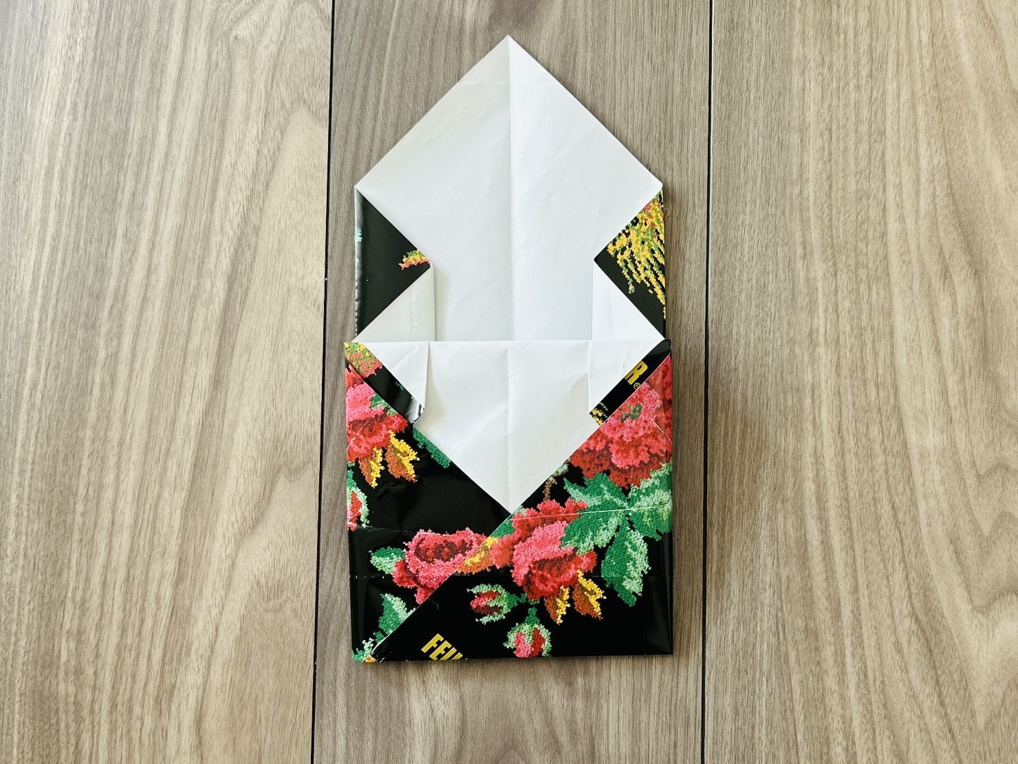 今回は、家にあった35×35cmの包装紙を使って折ります。
