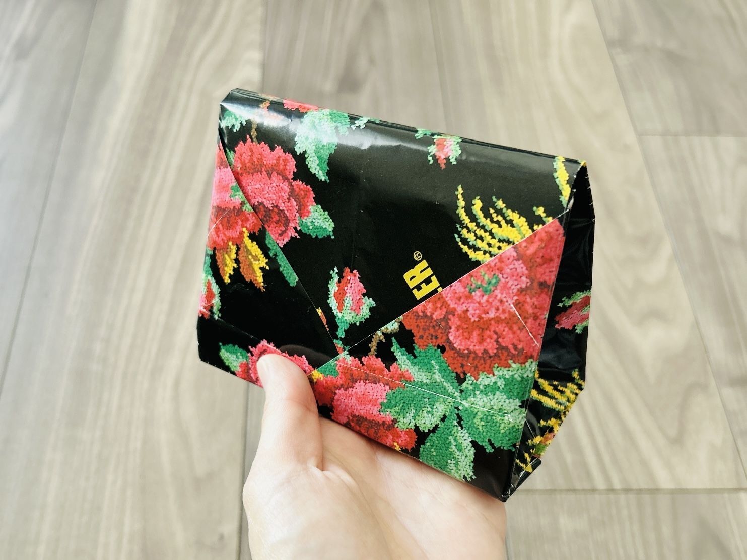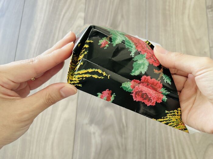 ちなみに、15×15cmの折り紙サイズの紙で折ると、ちょうど手のひらに乗るくらいの小さい紙袋ができますよ。