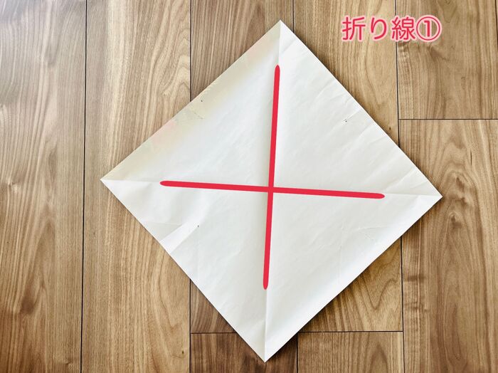 いったん開き、もう片方の角も同じように合わせて折り、このような折り線をつけます。(折り線①)