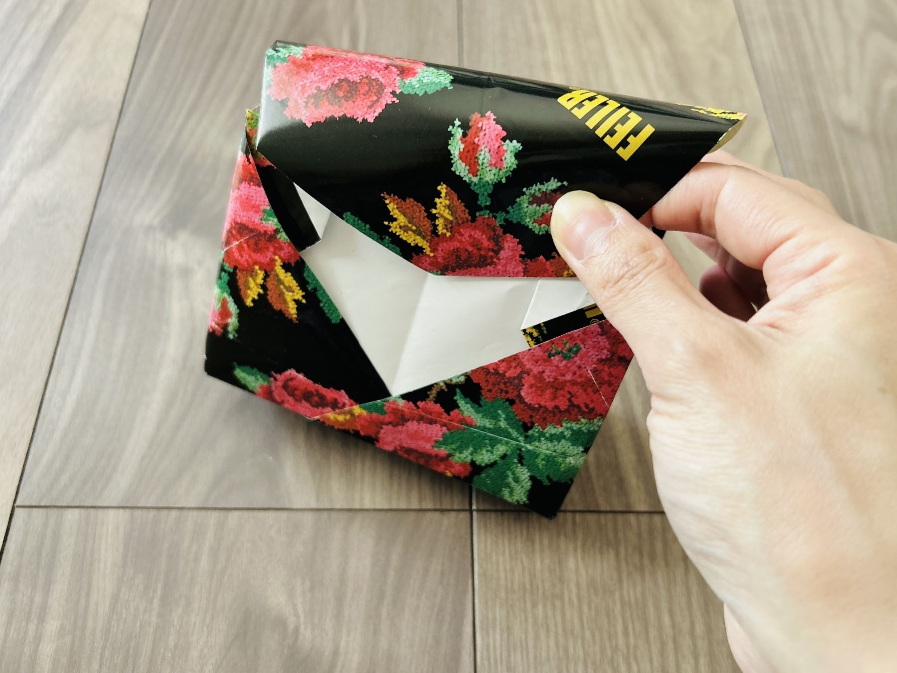 左側の角を開き、手前に折った部分を差し込みます。