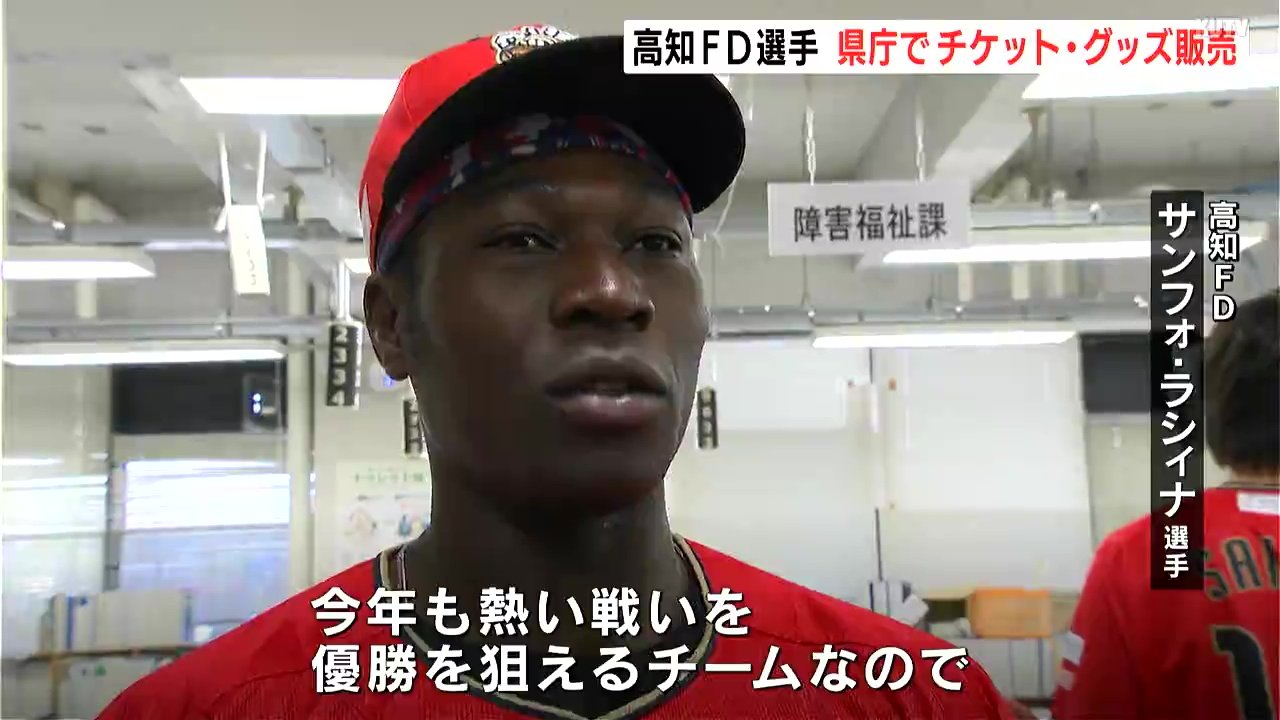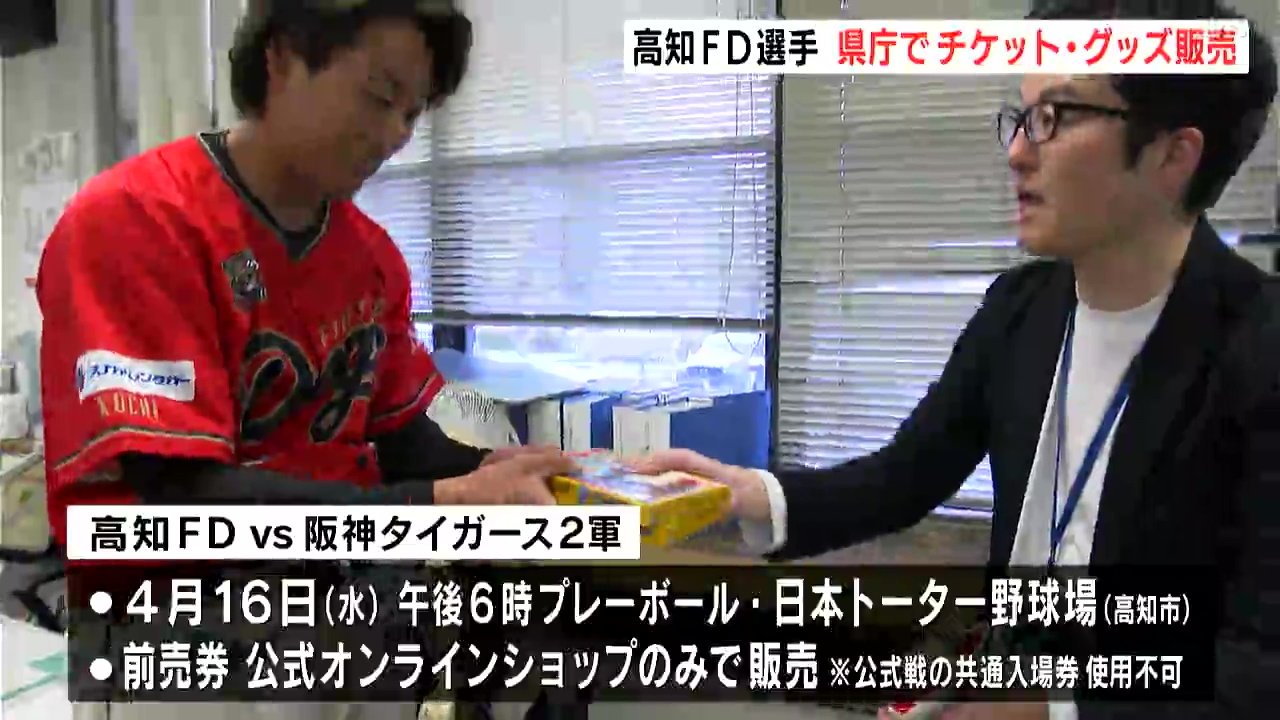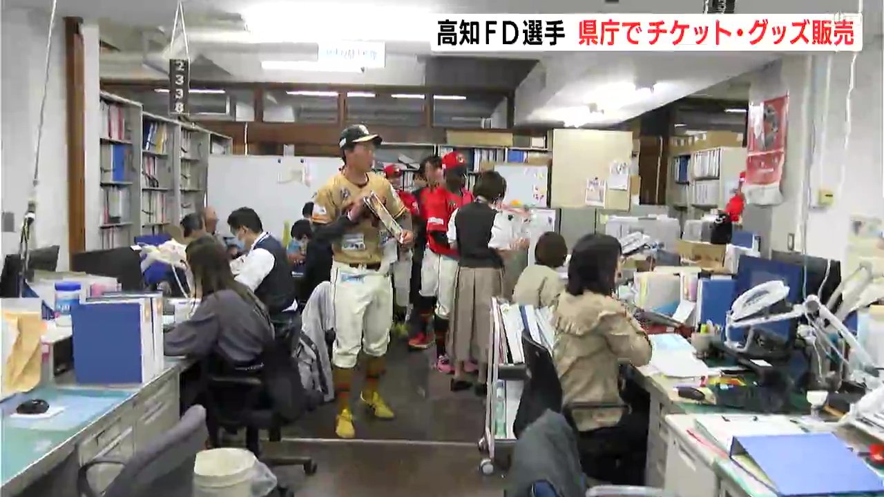高知ファイティングドッグスの選手たちが高知県庁でチケットやグッズを販売しました。