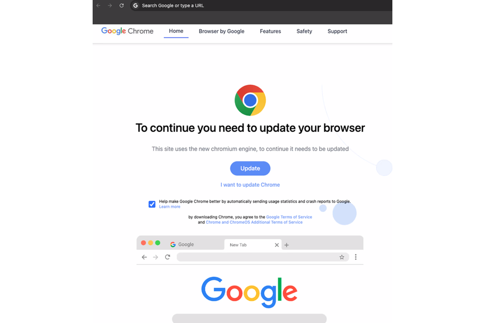 また、本物のGoogleなら「The site uses the new chromium engine, to continue it needs to be updated」の「engine」と「to」の間にコンマを入れたりはしないでしょう。