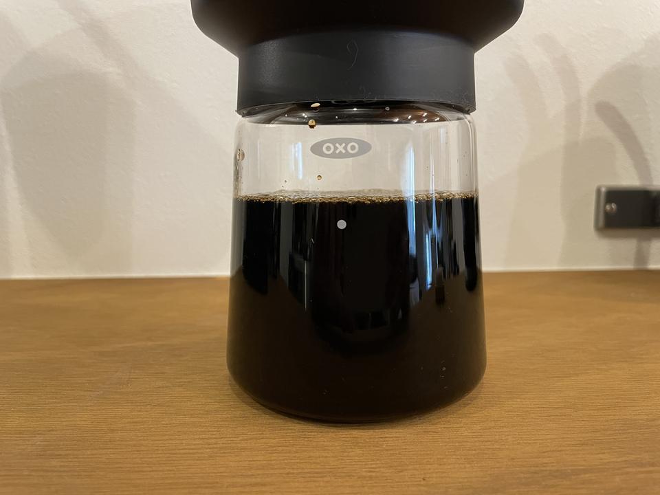 抽出された濃縮コーヒーは約470ml。これで5杯〜7杯分のコーヒーが飲めるそう。マニュアルに記載されたとおり濃縮コーヒー100mlに対して300mlの水を入れてみました。