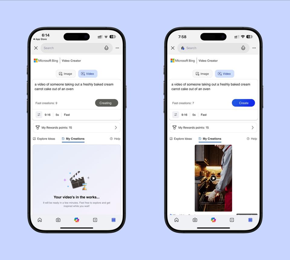 Microsoftはまず、iPhoneおよびAndroidのBingアプリに「ビデオ クリエイター」機能を展開し、近日中にウェブ版とデスクトップ版を提供します。