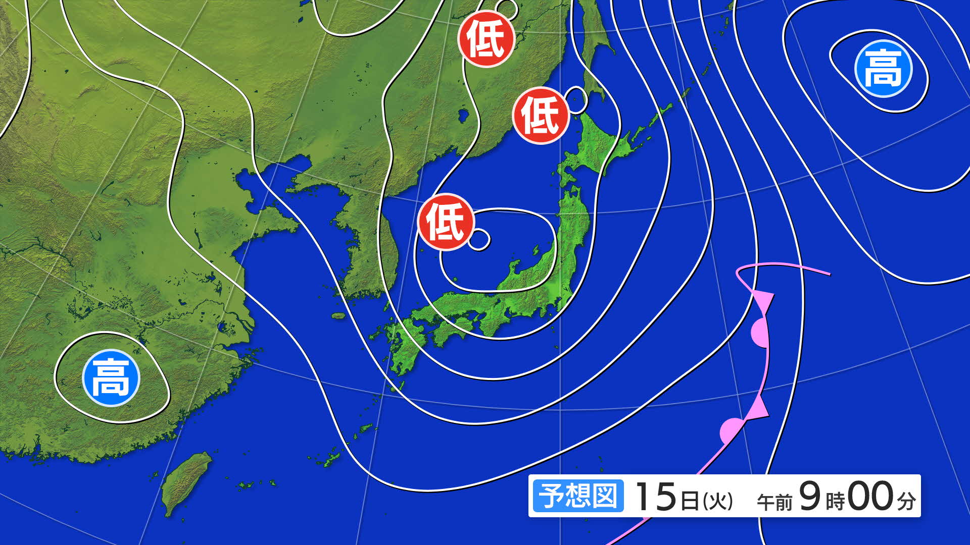15日午前9時の予想天気図です。日本海に低気圧があり、発達しながら北東へ進む見込みです。
