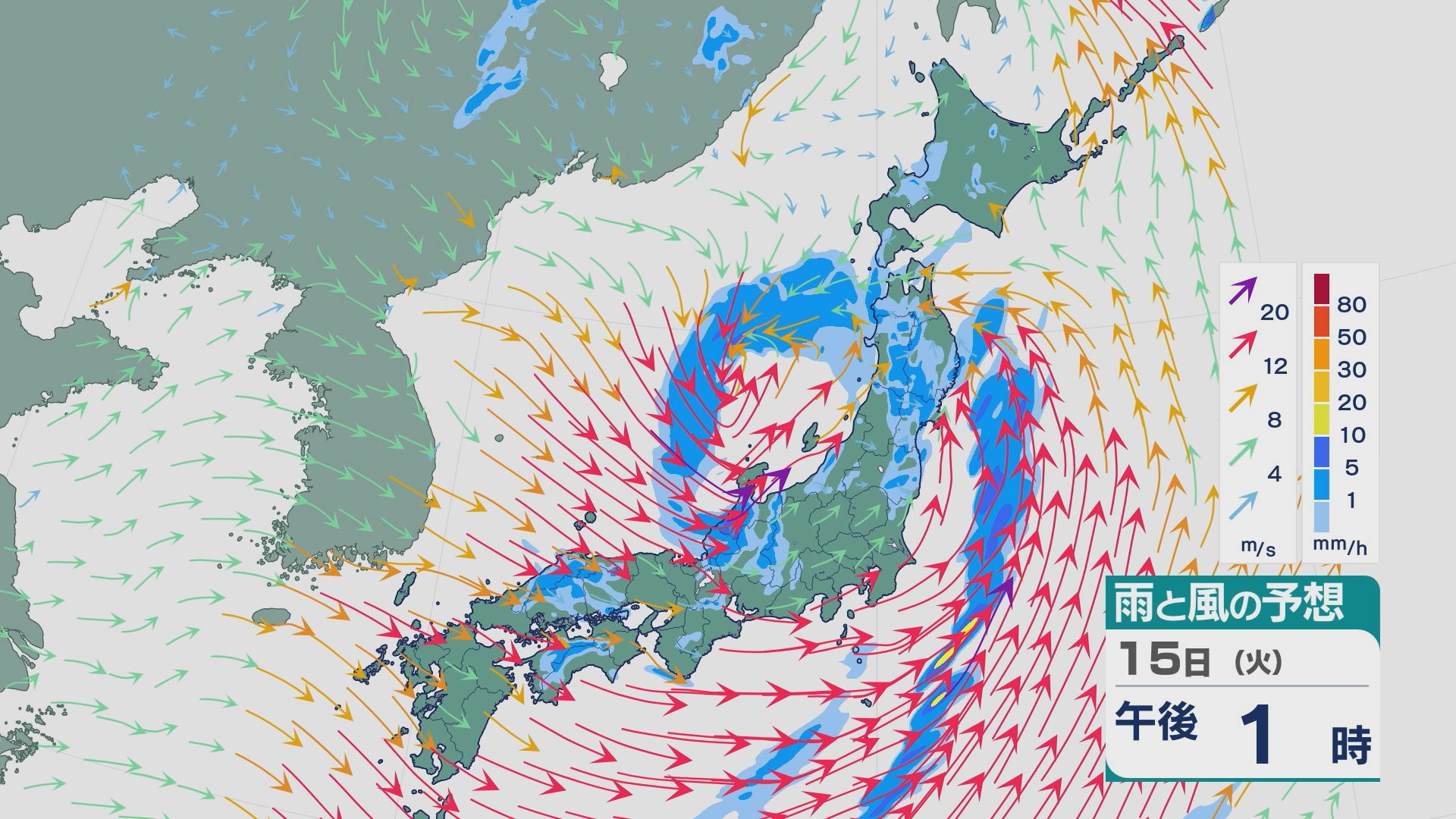 15日(火)は、日本海を低気圧が進むとともに上空に強い寒気が流れ込むなどし、西日本から東日本の広い範囲で大気の状態が非常に不安定になるでしょう。局地的に雨や風が強まるおそれがあります。急な強い雨や落雷に注意が必要です。