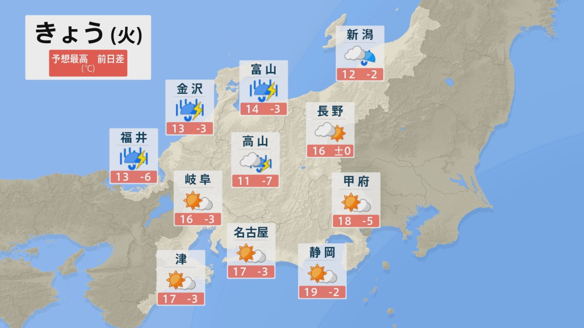 北陸や東北の日本海側では北西よりの風が強まりそうです。北陸では、海上で風速20メートルの非常に強い風、陸上で風速18メートルの強い風になるところもある見込みです。