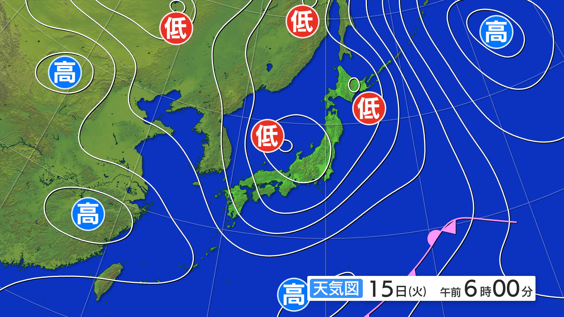 15日午前6時の天気図です。日本海に低気圧があり、発達しながら北東へ進む見込みです。