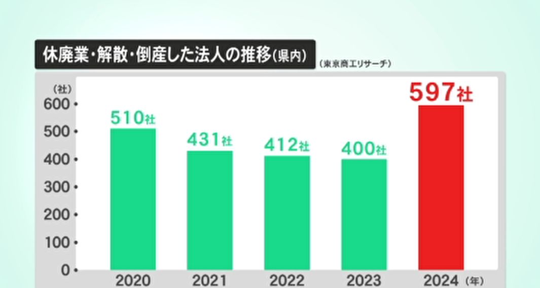 民間の信用調査会社、東京商工リサーチ金沢支店によりますと、県内で2024年、休廃業、解散、倒産した法人は597社と統計を取り始めて以降、最も多くなりました。震災と豪雨の影響がうかがわれます。