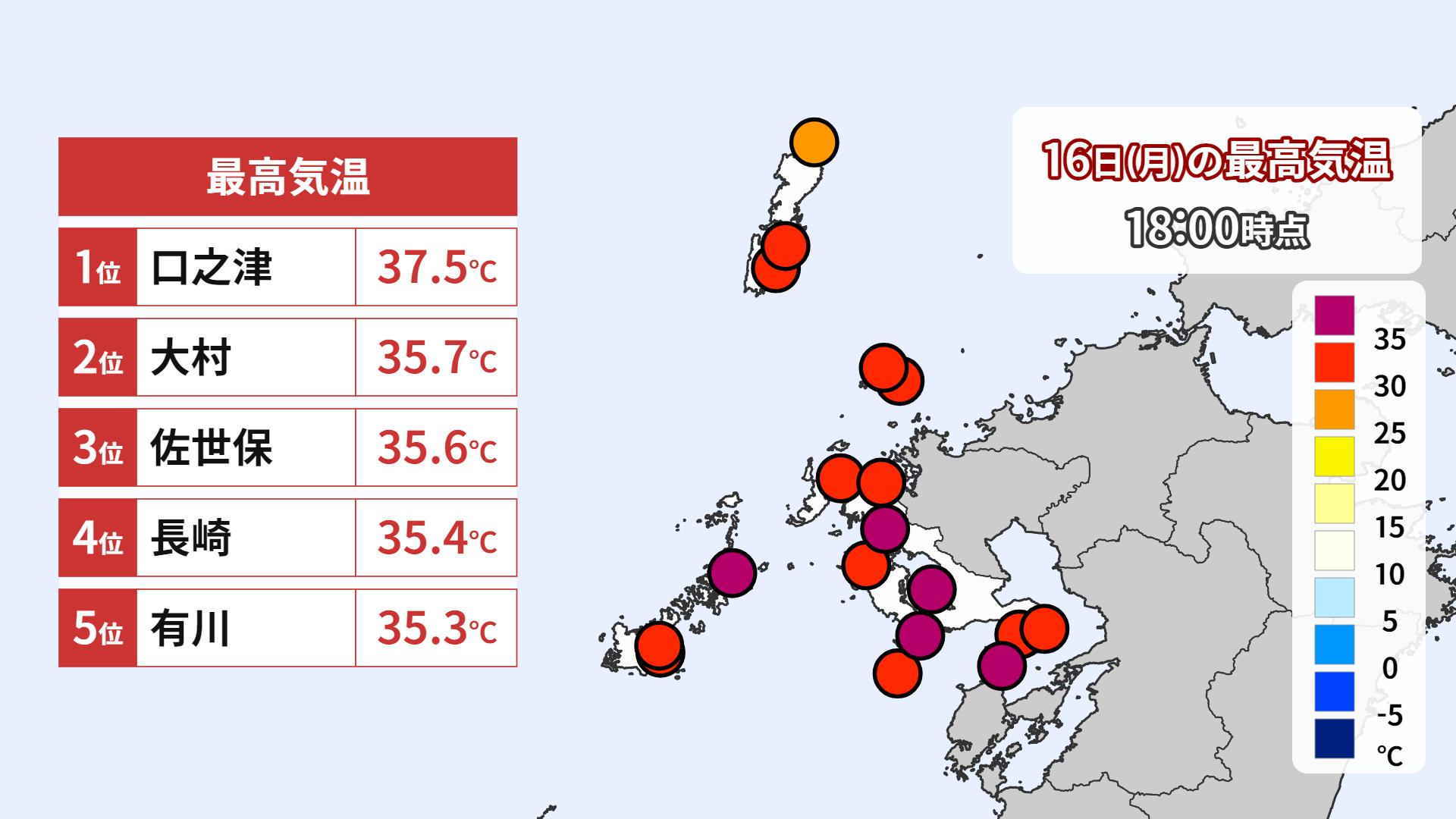 この暖かく湿った空気の影響で県内では気温も上がっています。南島原市口之津37・5度、長崎市35・4度、大村35・7度、佐世保35・6度、有川35.3度と各地で猛暑日となりました。