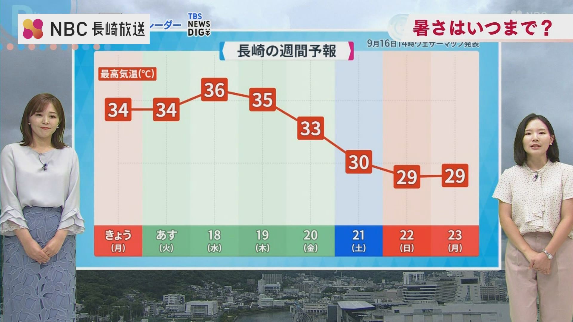 一方で金曜日以降になると秋雨前線の影響で曇りや雨のぐずついた天気となる見通しです。気温は30℃前後の予想。異例の猛暑はようやく落ち着きそうです。(16日午後6時現在 気象予報士 平地真菜)