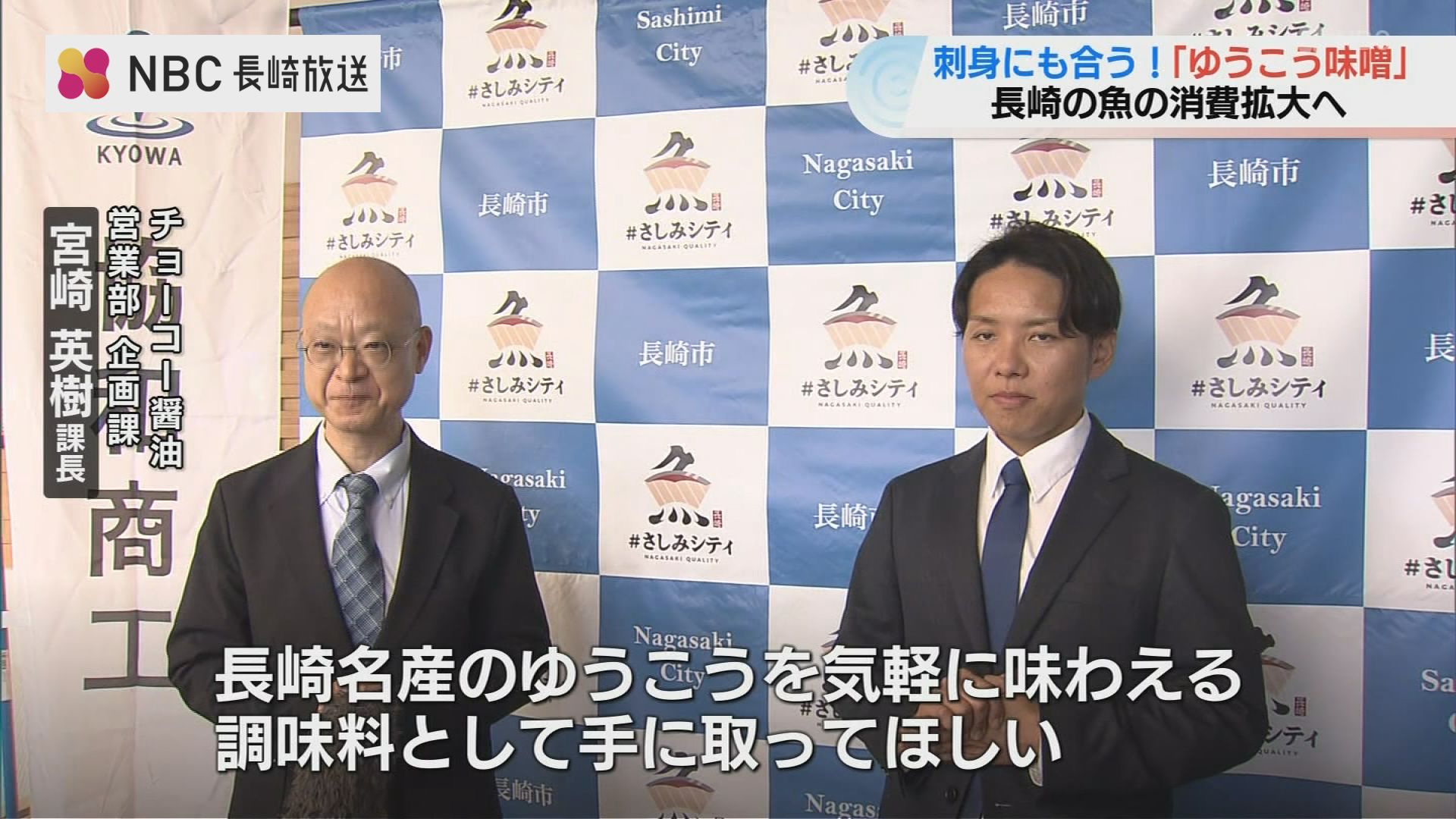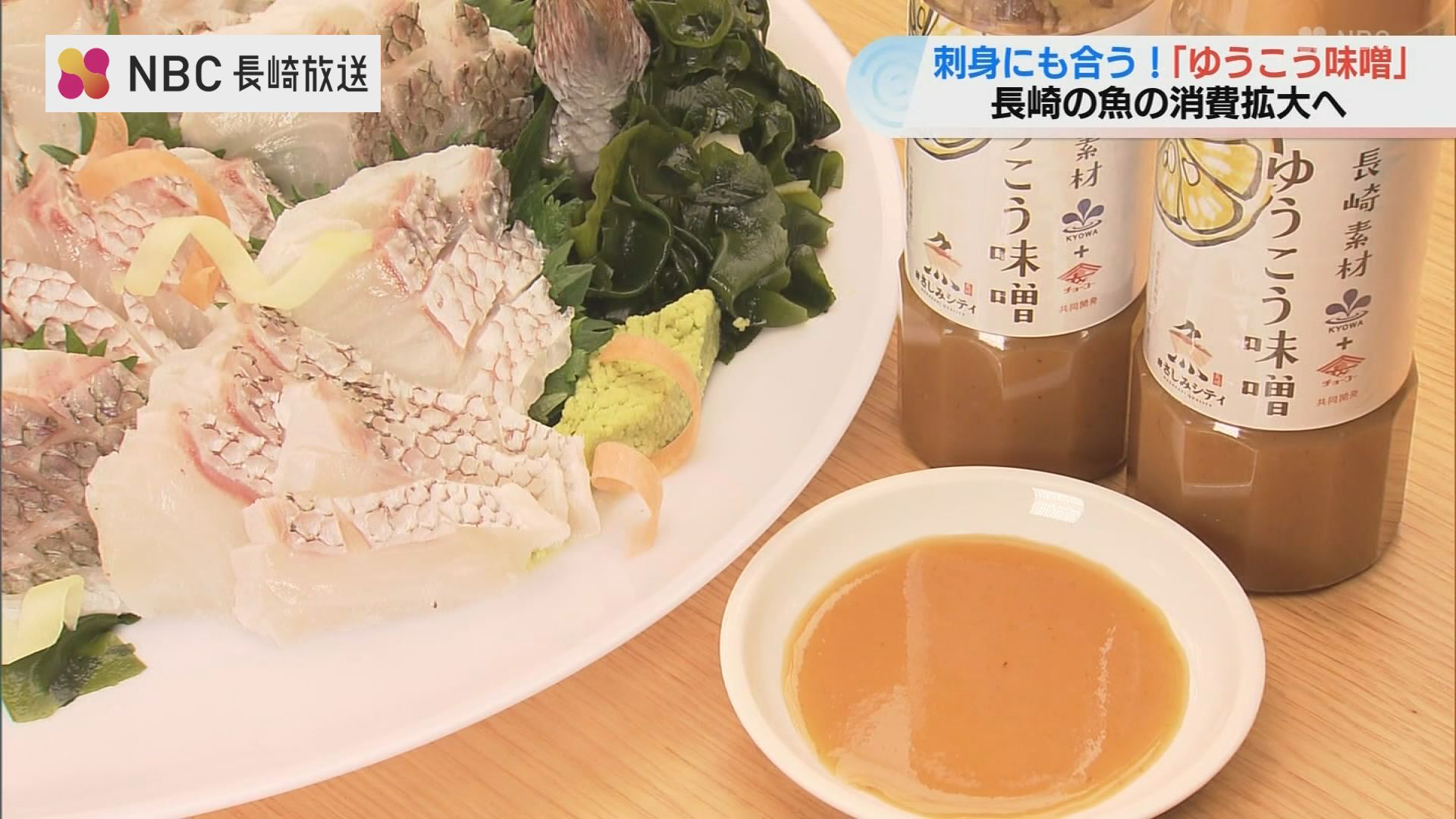14日長崎市役所でお披露目された新商品「ゆうこう味噌」は、県産の魚の新しい食べ方を提案し消費拡大に繋げようと、協和商工とチョーコー醤油がタッグを組んで作りました。