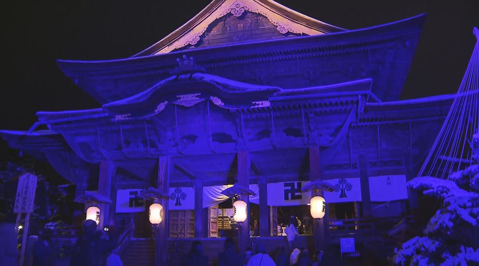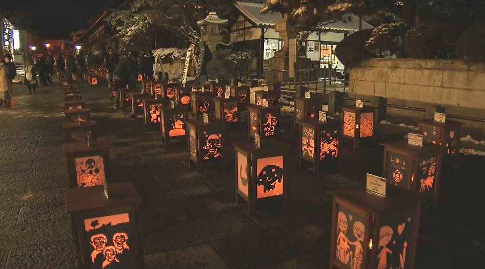 雪が残る参道には切り絵が浮かび上がる灯ろうも約150基並んでいて、幻想的な光景が広がっています。