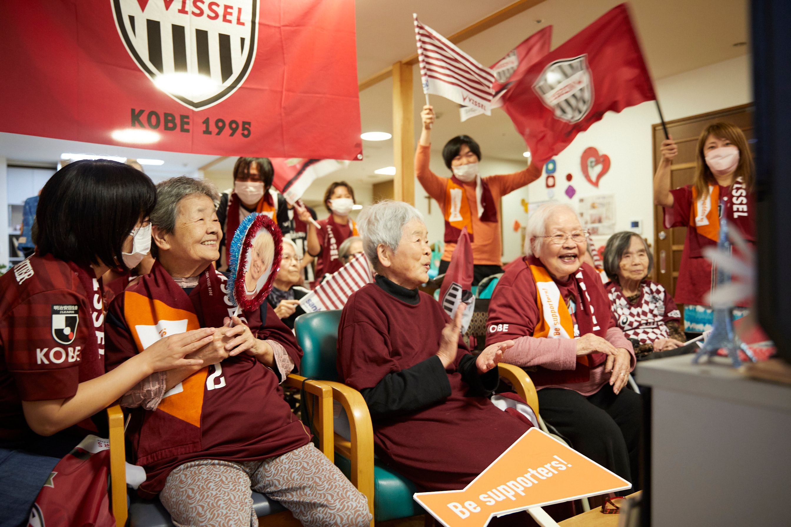 「Be supporters!」は、サントリーウエルネスと「Jリーグ」が共同で推進しており、「いくつになってもワクワクしたい、すべての人へ」をコンセプトとしている。高齢者が応援する選手を持つことで、日常生活に変化が生まれているという。例えば、脚が不自由な利用者が好きな選手の写真を見るために自力で歩くようになったり、リハビリに積極的でなかった利用者が応援時に腕を挙げるようになったりしているとされる。