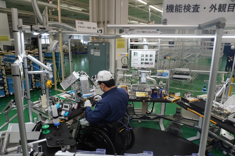 各工程で作業面に傾斜をつけたり、からくりや協働ロボットで部品を手元に供給するなど負担を低減する工夫がある。車いすの社員は「任せられた作業や工程を自分で完結でき、責任ややりがい、楽しさも感じる」と手応えを語る。