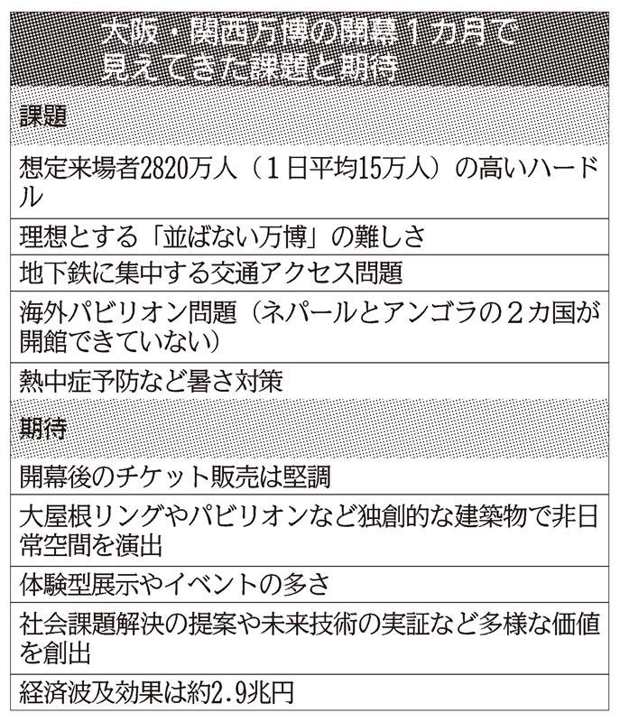 158カ国・地域が参加し、「各国の文化と科学がマッチした展示内容で面白い」(経済同友会の新浪剛史代表幹事)と経済界からも一定評価を得ている。日本総合研究所の若林厚仁主任研究員は「万博は単なるレジャー施設でない。無形資産やイノベーションなどの重要性が高まる中、こうした価値を次世代に提供できるかも重要な要素になる」と指摘する。収益や来場者数など数値で表せる価値以外に、万博が及ぼす多様な効果も見る必要がありそうだ。
