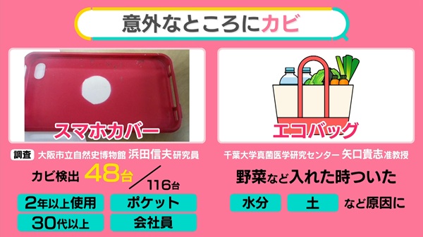 「皆さん、カビを持ち歩いていないですか? スマホカバーとエコバッグは、カビが生えやすいんです。スマホカバーはいかにカビが生えやすいか、大阪市立自然史博物館の浜田信夫研究員が、大阪周辺で街の人に協力してもらい、調査を行いました」