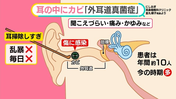「具体的には『外耳道真菌症』といい、鼓膜よりも外側の外耳道でカビが繁殖し、炎症を引き起こしてしまう病気です。にしおぎ耳鼻咽喉科クリニックの金丸朝子院長によると、症状としては聞こえづらい、痛み、かゆみなど。黒い耳垢が出て気づく人もいるそうです」