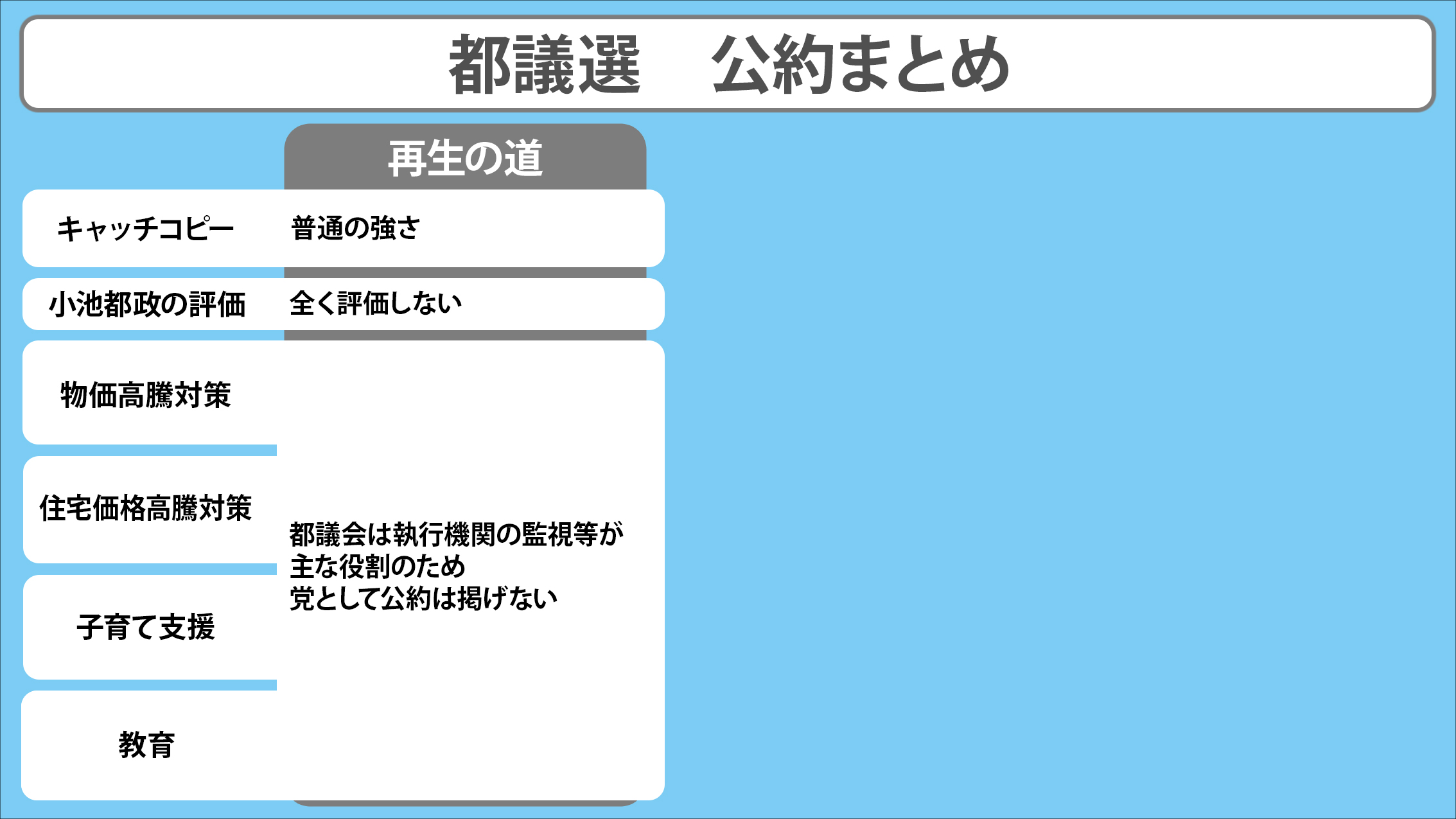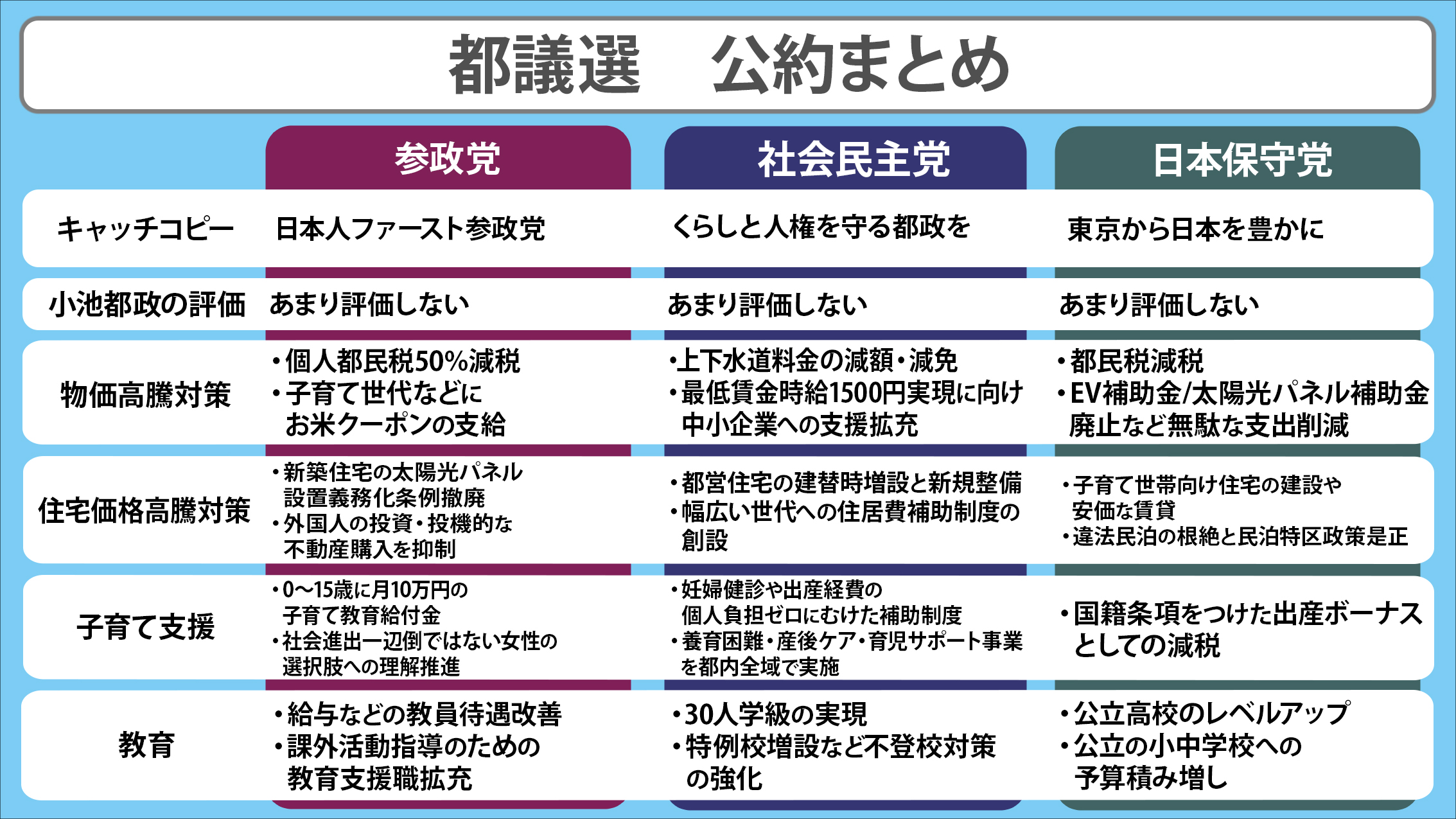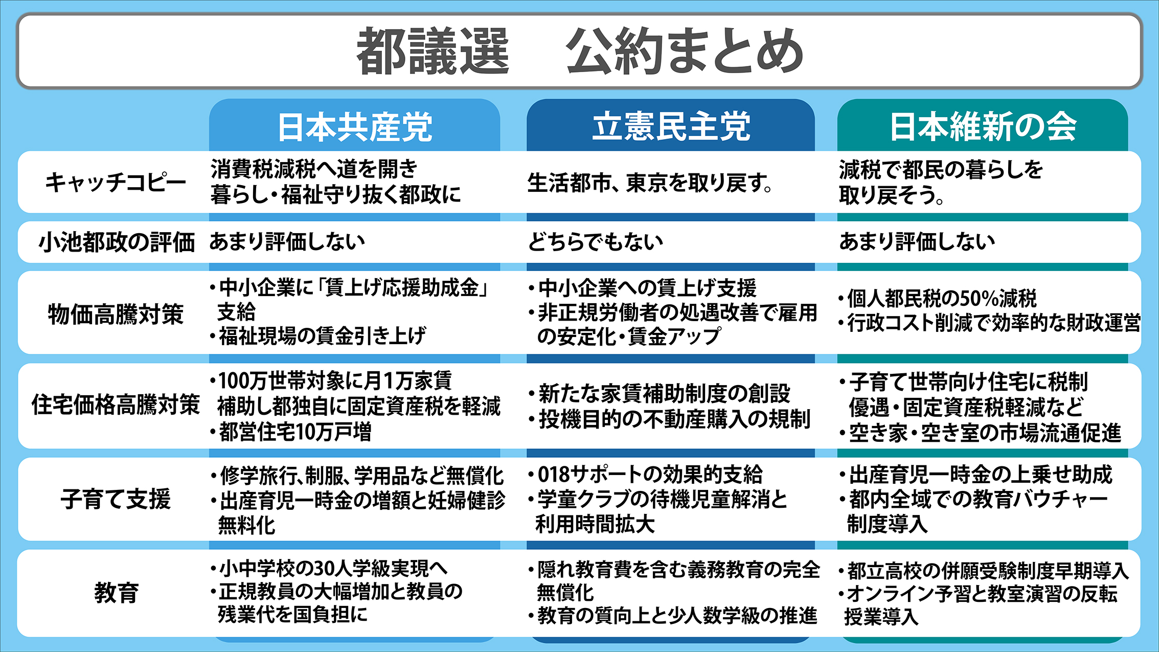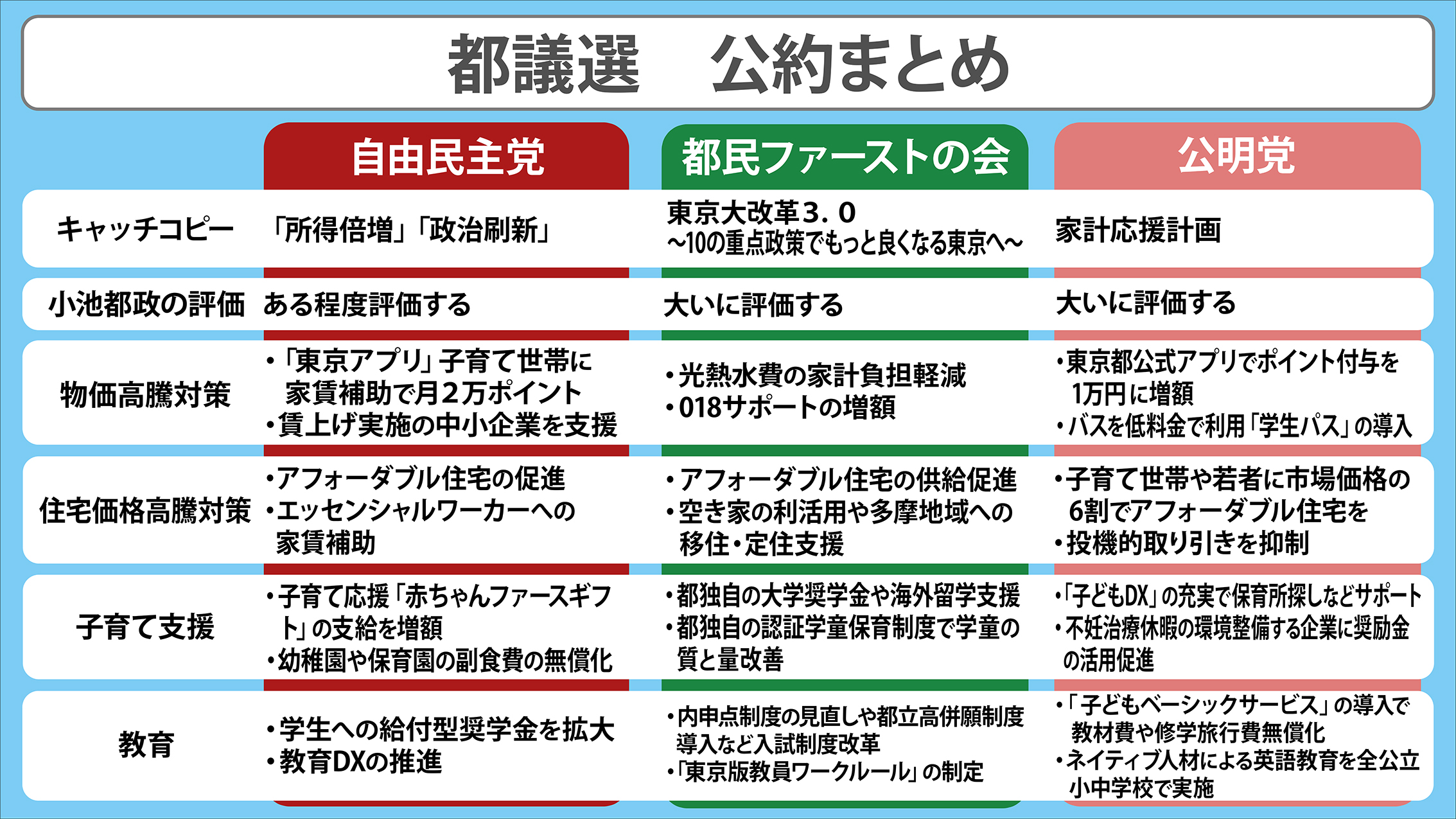 今月13日、東京都議会選挙が告示され、今月22日の投開票に向けて選挙戦がスタートします。日本テレビ独自のアンケート結果や番組内での発言、各党の会見などをもとに、各党が掲げる都議選の主な公約などを党別にまとめました。