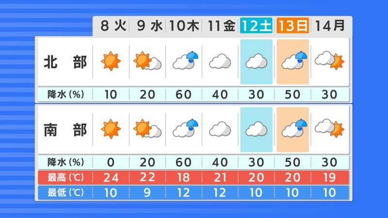 最高気温は各地で20℃を超える予想です。北部では、朝晩と日中の気温差が20℃前後と非常に大きくなります。服装でうまく調節して下さい。