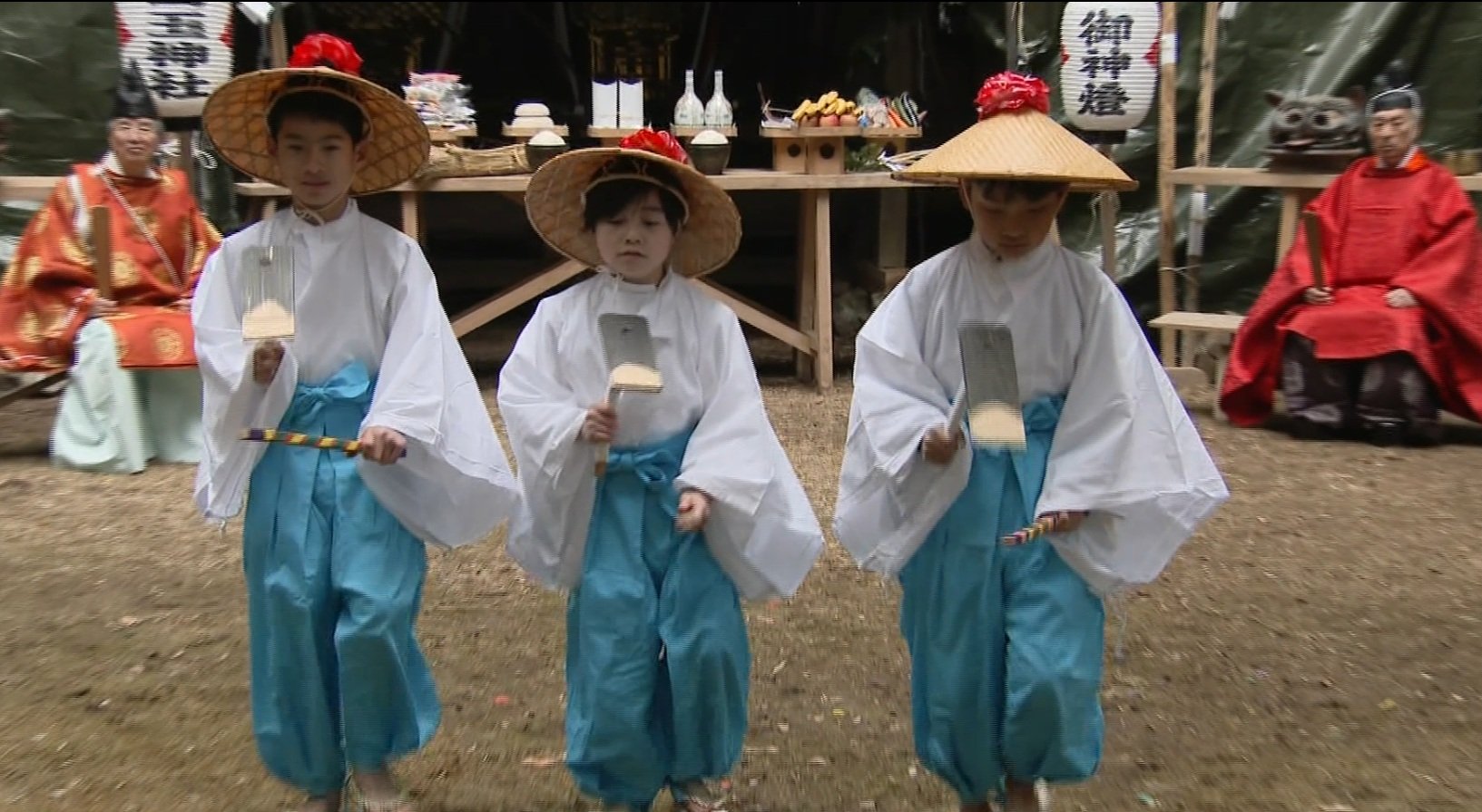 このあと、男の子5人が「田打ち」をします。田を固めていく作業でしょう。ぐるりと丸く切り開いた庭を、円を描いて歩いていきます。