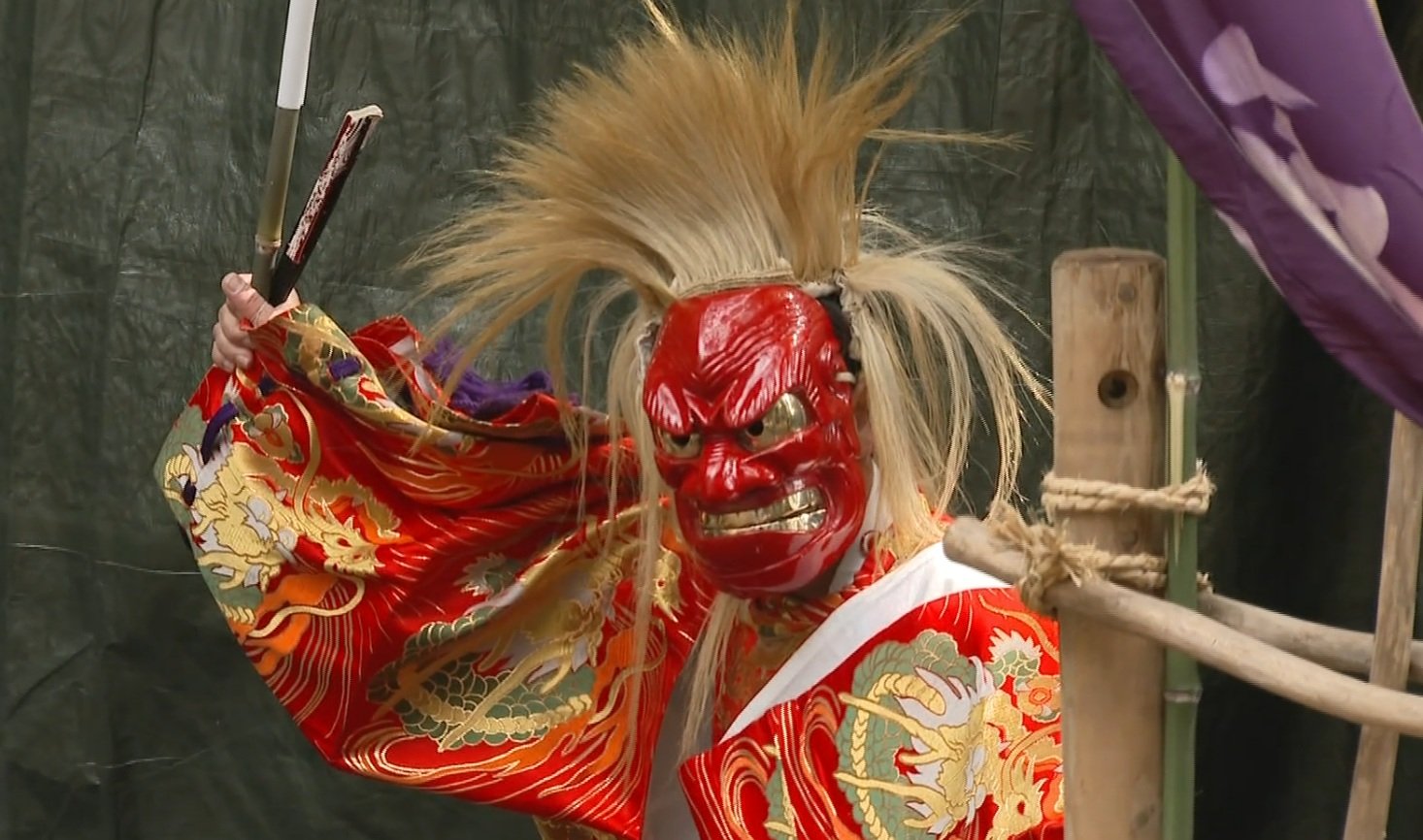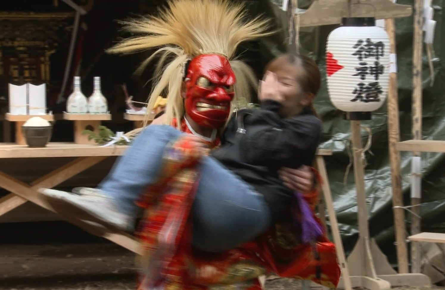 まずは豊前神楽が奉納されました。豊前神楽には、修験道の影響が強く残っています。神楽を舞い終えた鬼が、観客の女性を抱っこしようとしています。